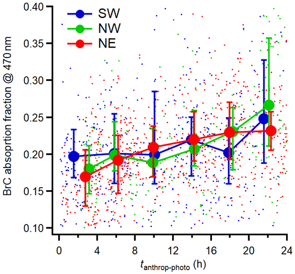 We presented a field measurement in a Paris suburban forest region to characterise the impacts of photochemical aging process on aerosol physical chemical properties. Photochemical production of organic aerosols increased forest fine particle mass and significantly enhanced absorption of short-wavelength sunlight. This study highlights the critical need to incorporate light absorbing carbonaceous particles formation mechanisms into models to accurately simulate their direct radiative impacts.