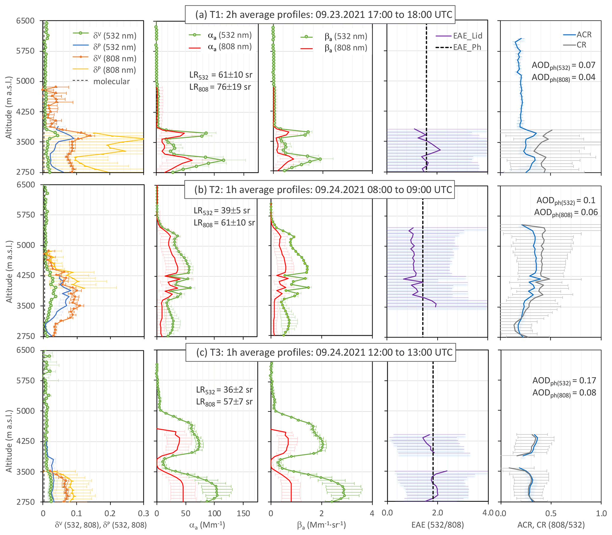 For further analysis of the aerosols observed at Izaña, we selected three time frames (T1, T2, T3) of 1 to 2 h on average, which improves the signal-to-noise ratio (SNR) and results in more reliable information (Fig. 4). The aerosol properties presented in Fig. 4 (from left to right) are δv (532, 808), δp (532, 808), αa (532 and 808), βa (532 and 808), EAE (532/808) from the CE376 and the collocated photometer, and CR (808/532) and ACR (808/532). The analysis of the results is presented below.