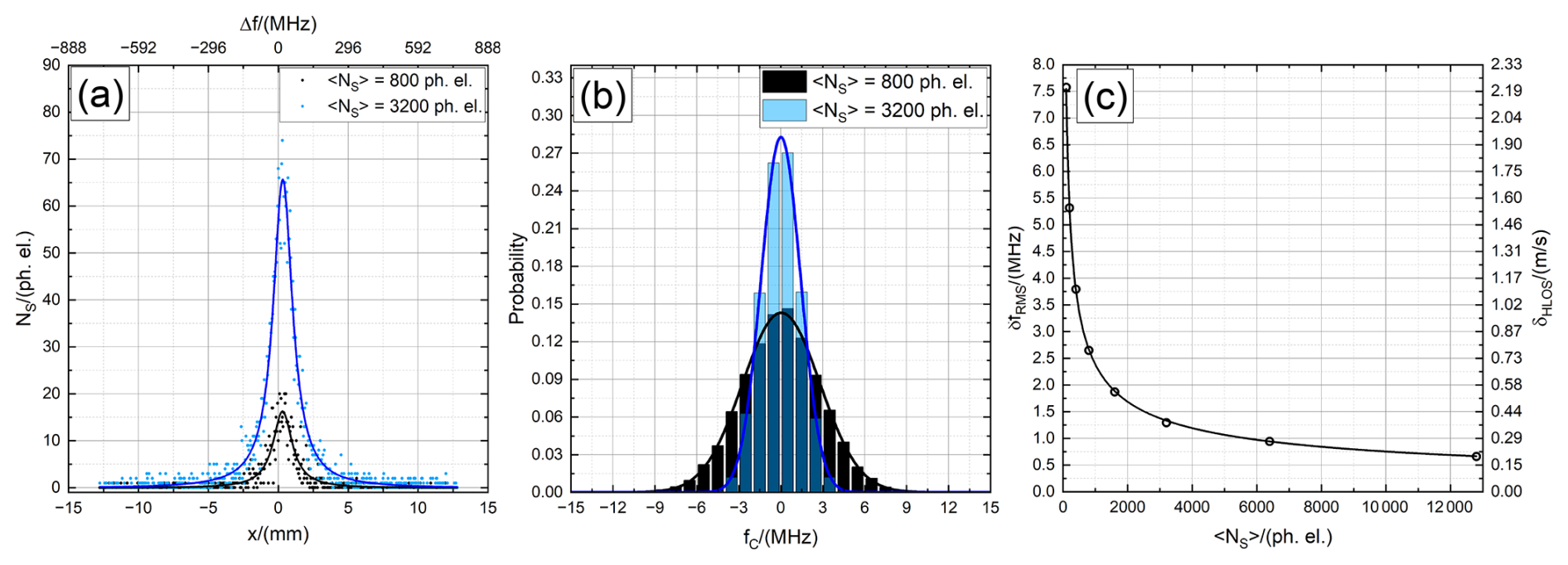 where denotes the area under the peak. Now, Eq. (4) is applied in a least-square fit procedure to the measured prototype fringes, as shown by the dashed blue lines in Fig. 2. The resulting fit parameters are given in the inset. It is obvious that the accordance of the fit with the measured fringe is not good, especially in the wings of the fringe, and this is most pronounced for the ATM fringe (Fig. 2b). The resulting widths are ≈160 MHz for the INT and ≈185 MHz for the ATM signal, which is close to the estimate of ≈172 MHz as given above, when considering a laser pulse profile of width ≈50 MHz and a Fizeau profile of width ≈90 MHz, both having a Lorentzian shape. However, the poor accordance of the fit reveals that the actual contributions to the fringe profile are of different nature.