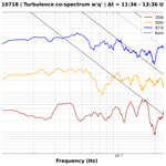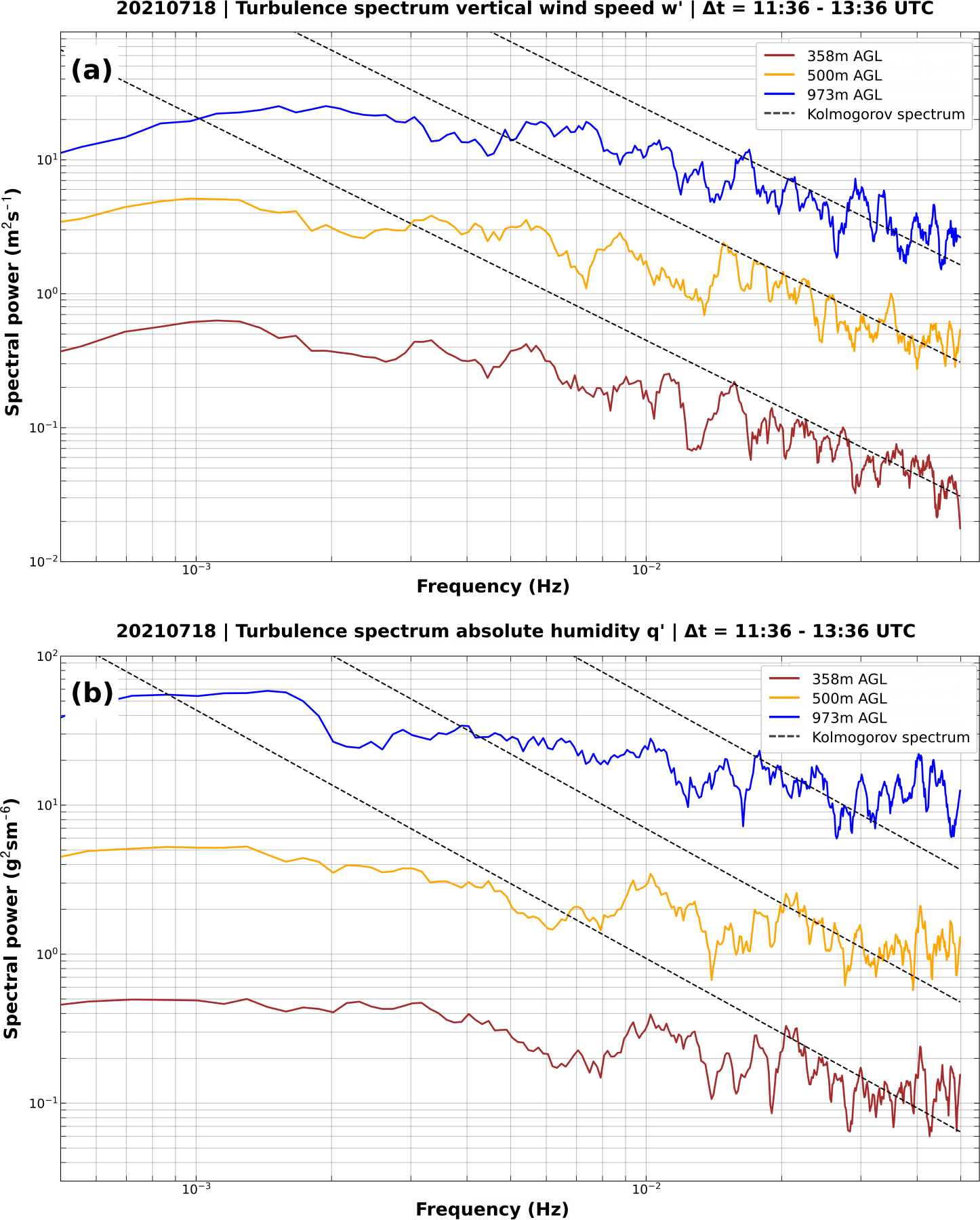 Figure 9Turbulence spectra of (a) vertical wind w′ and (b) absolute humidity q′, calculated for the 2 h time period 11:36–13:36 UTC at three identical altitudes which are all inside the PBL. For better visibility, the results have been vertically scaled. Also, the representation of the spectra is smoothed by applying a Savitzky–Golay filter of order 1 over a width of 10 bin. The dashed line shows the Kolmogorov dependency.