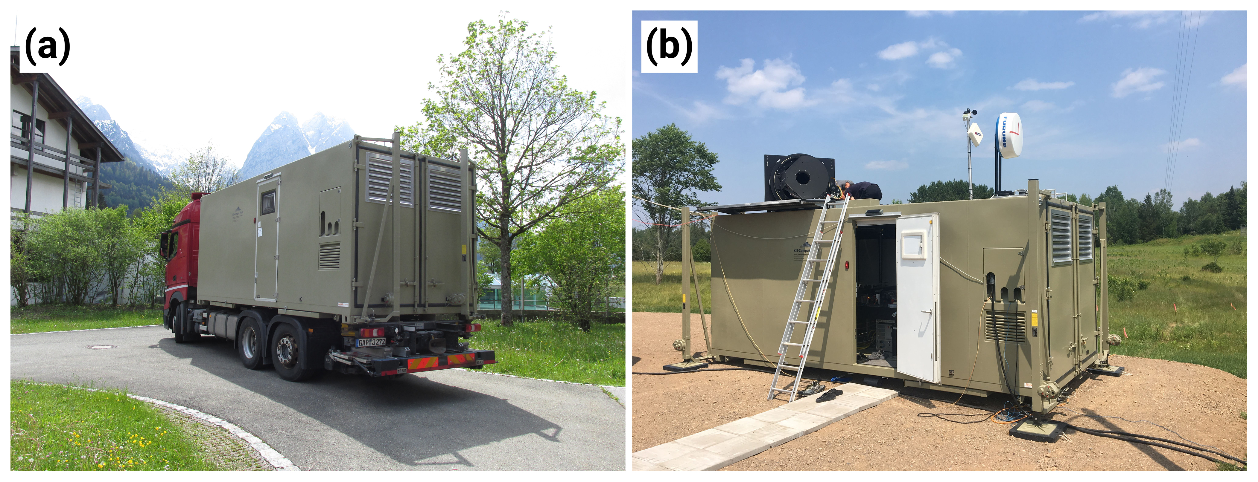 Figure 1(a) The ATMONSYS lidar during truck transport. The swing-out leveling jacks can be seen at the rear side of the container. (b) Setup container with elevated periscope. Also seen is the vertically pointing safety radar as well as the basic meteorological measuring rod, ensuring closing of the ceiling flaps in case of rainfall.