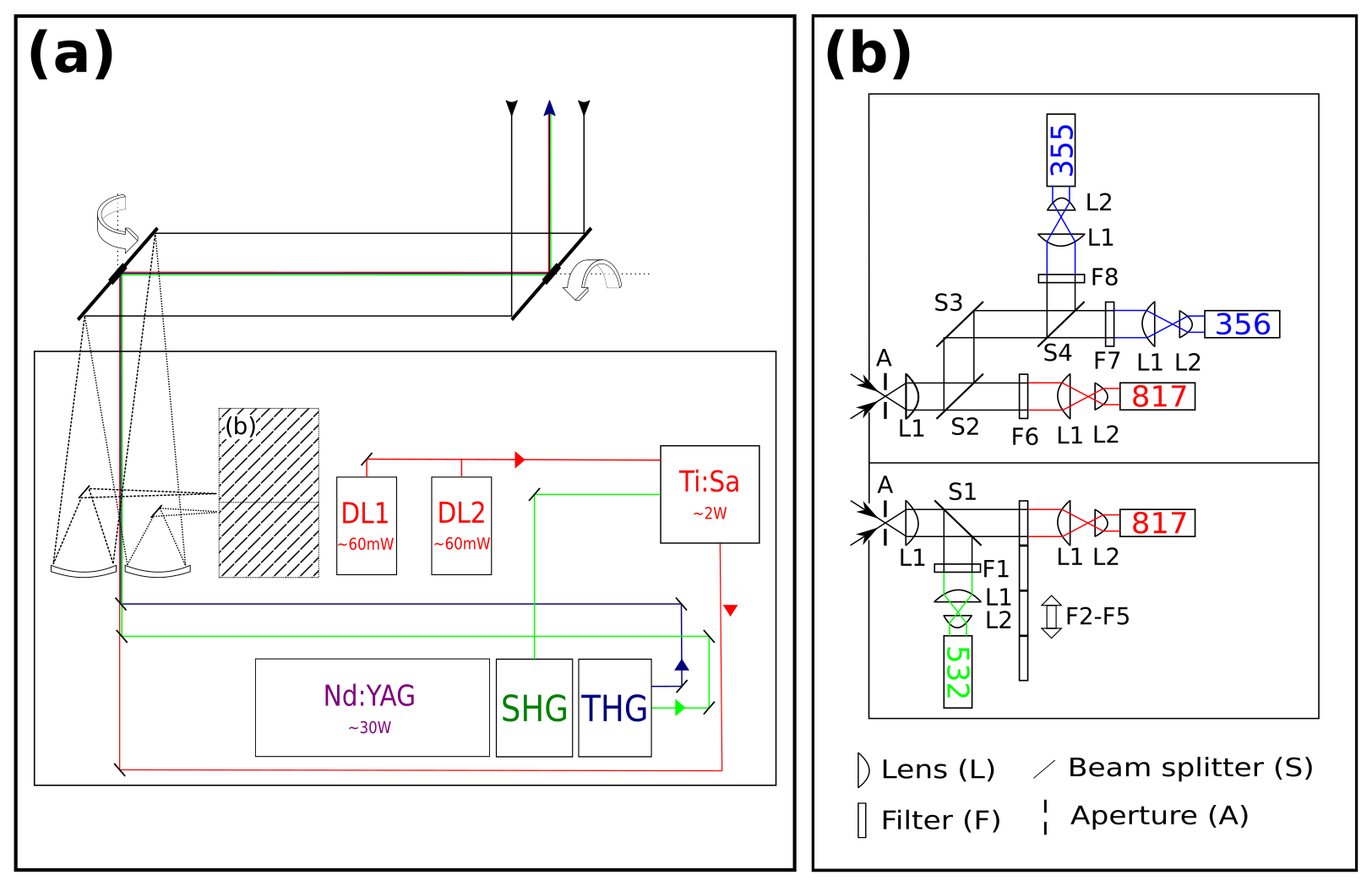 As mentioned above, the ATMONSYS lidar consists of three different lidars for the measurements of water vapor, aerosol, and temperature. A sketch of the general optical concept of both the ATMONSYS lidar emitter and receiver is presented in Fig. 2.