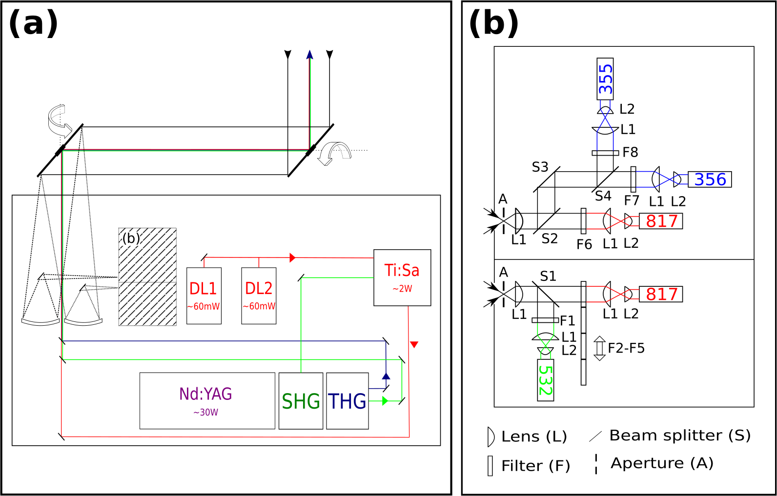 Figure 2Sketch of the overall optical setup. (a) Top view of the optical bench inside the container box with seeding diode lasers (DLs), one Nd:YAG laser with second-harmonic and third-harmonic generators (SHG/THG), and the Ti:Sa laser system. The outgoing laser emission is transmitted via small mirror inlets in the rotatable periscope mirrors on the roof. The big mirrors (dmin=64 cm) direct the backscattered light towards two receiving telescopes. (b) Receiver with light paths for both receiving telescopes.