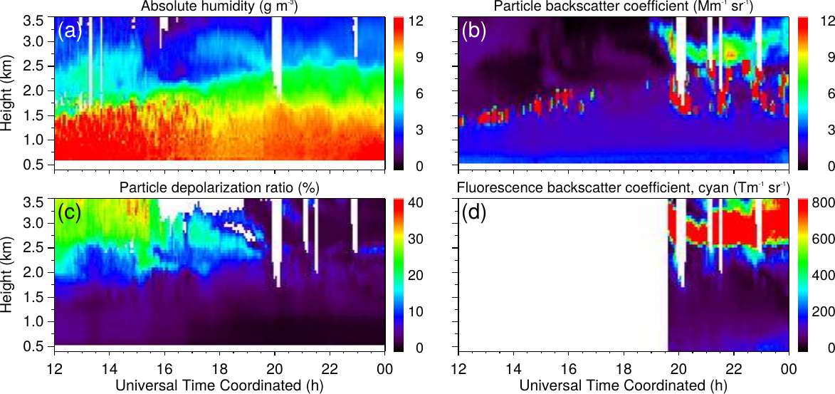 Besides a general idea of the PBL development, the particle backscatter coefficient shows the development of convective clouds passing over the lidar from 12:00 to 16:00 UTC. Starting around 20:00 UTC, dense clouds develop underneath an elevated aerosol layer which is located at ≈ 2.5 km. Furthermore, the combination of Fig. 5b–d reveals valuable information about the dynamical situation of aerosol concentrations during the second half of this day. From 12:00 until 20:00 UTC, the particle depolarization ratio shows increased values between ≈ 2 and 4 km, hinting towards elevated concentrations of dust particles. Between 20:00 and 24:00 UTC, the already mentioned enhanced particle backscatter coefficients at ≈ 2.5–3.5 km show almost no particle depolarization ratio. However, the fluorescence backscatter coefficient of this layer is significant with very high vertical gradients. Based on those features, the origin of this aerosol layer can be connected with wildfires. Section 2.3 already discussed the potential issue with fluorescence backscatter in the 817 nm DIAL channel, which could be caused by strong emission power at 355 nm. Although the ATMONSYS system does not operate with such high power at this wavelength, Fig. 5d impressively shows very steep fluorescent backscatter coefficient gradients.