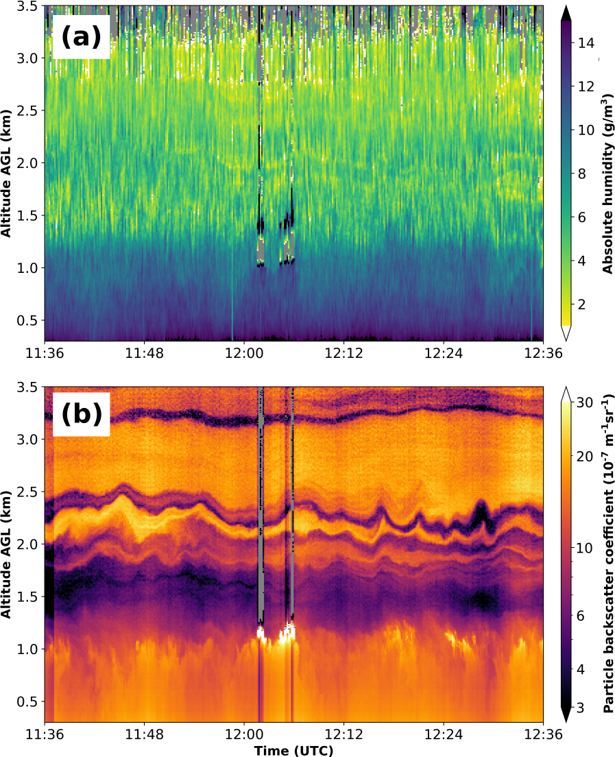 Figure 6ATMONSYS lidar data from 18 July 2021 for vertical and temporal highly resolved time series of (a) absolute humidity and (b) aerosol backscatter coefficients during high noon under clear-sky conditions and a temporal resolution of Δt=10 s. No temporal smoothing has been applied.