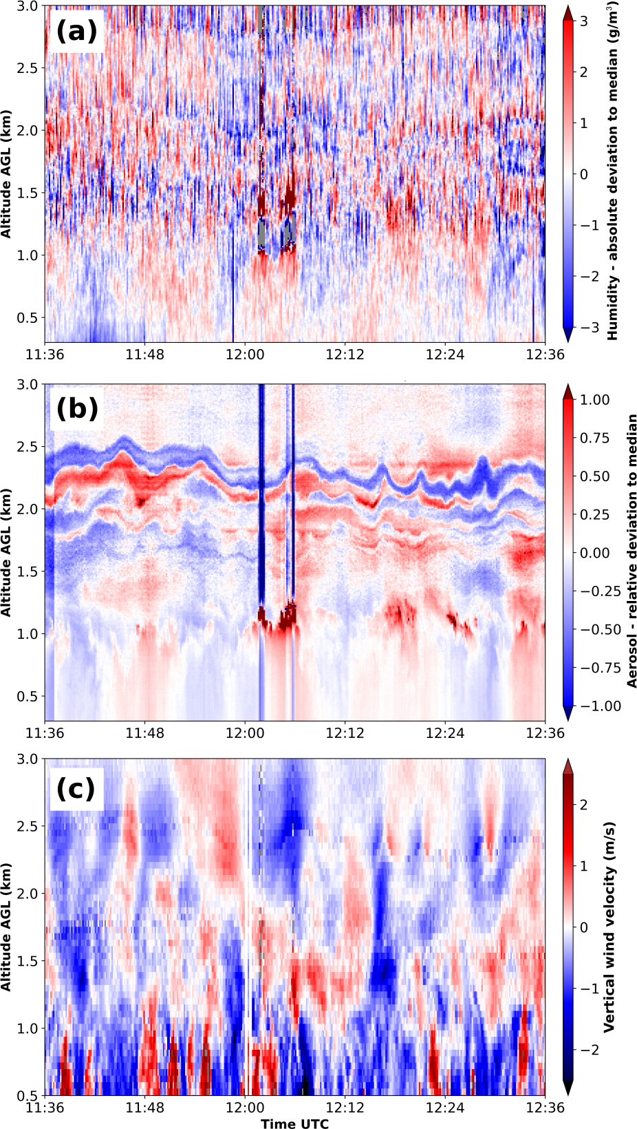 Over the presented time period of 1 h, structures of alternating moisture concentrations can clearly be observed throughout the entire PBL in the form of darker plumes (e.g., at ≈ 11:48 UTC) which are surrounded by drier time periods with lighter color shading. Those changes can also be studied in more detail within Fig. 7a. As the structure of those humidity plumes is non-periodic, we can attribute this behavior to convection. However, the direct linkage between convective updrafts and changes in humidity is not always straightforward as can be seen in the following. For an exemplary purpose, in order to visualize correlations in changes of humidity and aerosol concentration with convective phases, their changing structures can be highlighted by calculating absolute and relative changes to the median in each height level: