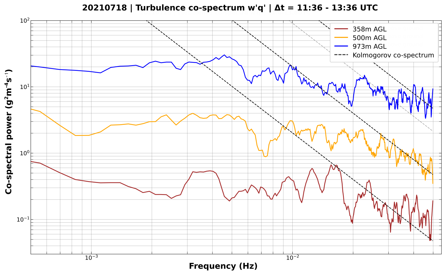 Looking at the co-spectra, it becomes apparent that the spectra of q′ and w′ do not always follow the same behavior, as the co-spectra can show different features compared to the single spectra. Especially at the altitude level of 500 m, the co-spectrum consistently follows the Kolmogorov -relation for higher frequencies (). However, similar to the single spectra, the co-spectra also show frequency bands with almost constant energy levels. In contrast to the single spectra, the frequency bands in which deviations from the Kolmogorov law appear are now non-identical for the shown altitudes. From the analysis of more altitude levels, which are not included here, it could be observed that the intervals with strict accordance with the dashed Kolmogorov line do change their frequency range non-systematically over height. Therefore, we conclude that those features are not the result of any systematic error. The co-spectra of all altitudes flatten towards lower frequencies, the lowest around < 5 Hz, which is in agreement with a similar behavior that could be seen for low frequencies in the DIAL humidity and mostly the Doppler wind turbulence spectra and, therefore, does not indicate a general DIAL deficiency at low frequencies. As a consequence of the observed flattening of the co-spectra, first of all, we conclude that the variations in vertical latent heat flux slower than are not generated by the decay of larger eddies but represent the initial variability by the first order of large eddies or advected horizontal inhomogeneity. As the co-spectra do not show identical structures as within the initial spectra of w′ and q′ towards lower frequencies, we secondly conclude that the variations slower than are independent and decoupled for w′ and q′ and have different origins. This hints towards the hypothesis that the variability of q, at least in high PBL altitudes, is in large part a result of the horizontal advection of inhomogeneous air masses, while the variability of w is dominated by convective dynamics. However, looking at the highest frequencies of the co-spectra, agreement with Kolmogorov's law is apparent at all altitudes, despite minor differences in the frequency range of good agreement. This is true even besides the general point that spatial averaging of the lidar data leads to losses of the high-frequency contributions of very small eddies (Brugger et al., 2016; Puccioni and Iungo, 2021). The advantage of co-spectra is that the noise of w′ and the noise of q′ are not dependent on each other. This has the pleasing effect that higher noise levels from one instrument can be partly compensated for by another instrument with better high-frequency quality.