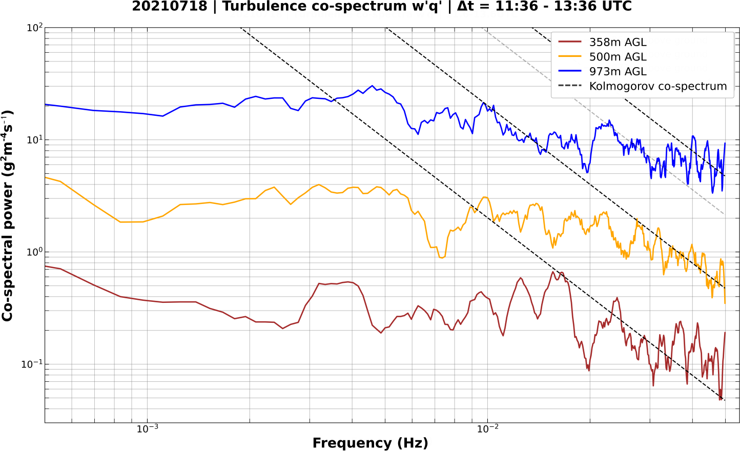 The comparison of the turbulence spectra for both humidity q and vertical wind w (Fig. 9) reveals several features. First, the wind spectra for w′ are visually in good agreement with Kolmogorov's law from ≈ 1.5–5 Hz at all presented heights. At the frequency of ≈ 1.5 Hz, a drop towards lower energies is visible at all heights – although the spectra still show parallel behavior to the dashed Kolmogorov line down to ≈ 6 Hz. For all three altitudes, but most dominantly for the spectrum line at 500 m, a second drop of energies towards lower energy can be observed at ≈ 9 Hz. Similar, but not identical, structures can be observed for the humidity spectra. Here, agreement with the Kolmogorov spectrum is obvious in the frequency range of ≈ 2–3 Hz across all altitudes. However, the spectrum of q′ does not always follow the dashed Kolmogorov line. Horizontal “energy plateaus” can be seen almost simultaneously at all three altitudes, e.g., from ≈ 1.5–2 Hz and ≈ 3–4 Hz. Nevertheless, at both lower and higher frequencies, the spectra change again from plateaus to a decline of energy, parallel to the dashed line of the Kolmogorov spectrum. Even at the highest frequencies of the DIAL (≈ 4–5 Hz), where white noise would be expected the most, the spectra at all three altitudes are parallel to the Kolmogorov line. Interestingly, at least the q spectra for 358 and 500 m show agreement with Kolmogorov even towards lower frequencies (≈ 4 Hz), as this is the case for the w′ spectra. This would imply that turbulence is more relevant for the local moisture variation at lower frequencies than it is for vertical winds. An atmospheric reasoning for such differences could be multifaceted. However, it seems plausible that external drivers such as solar radiation at the surface due to clouds in combination with horizontal advection can lead to a decoupling of the behavior of q and w in their accordance with Kolmogorov's law – especially over heterogeneous terrain.