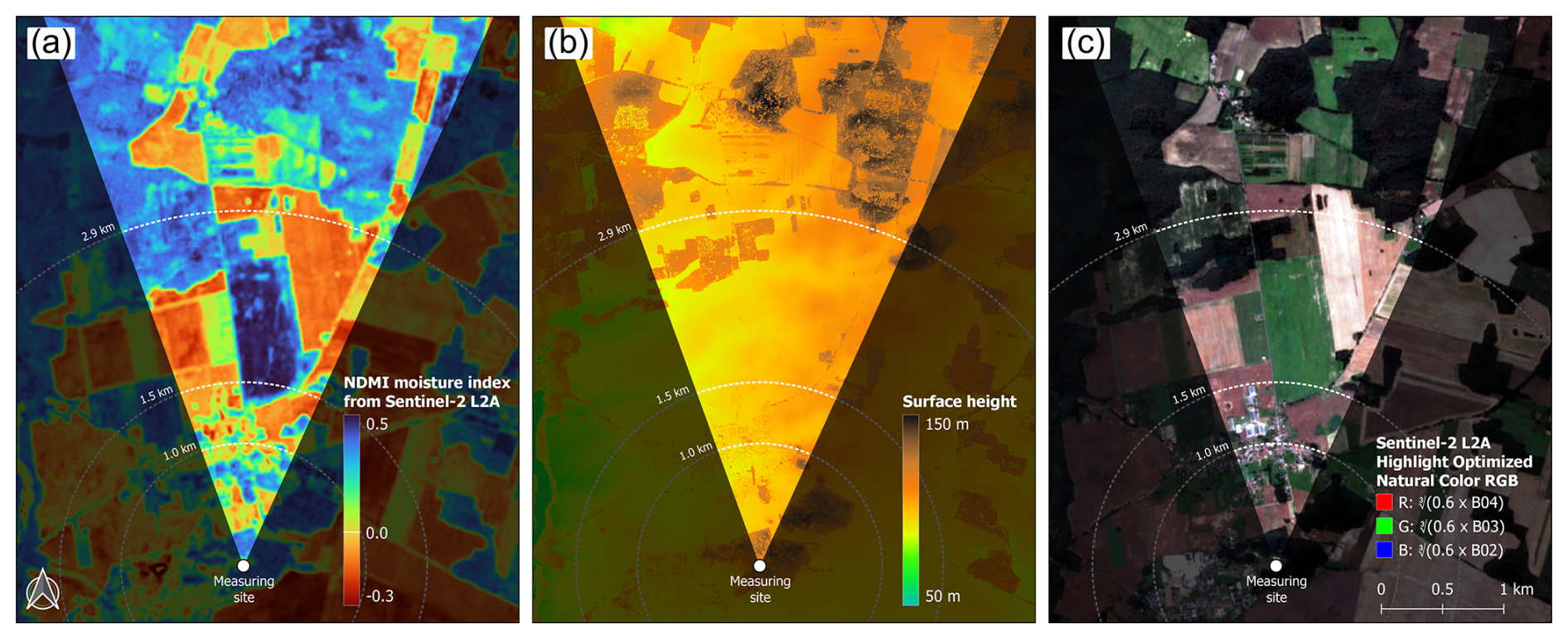 Figure 11Overview of the surrounding landscape of MOL-RAO in Lindenberg. The highlighted circular segments correspond to the prevailing wind directions (340–20°) towards the ATMONSYS lidar in the circle center from 11:36–13:36 UTC on 18 July 2021. Panel (a) shows the normalized difference moisture index (NDMI) as measured by Sentinel-2, and panel (b) shows the surface height over sea level from a digital surface model. Panel (c) shows the RGB channel, again observed by Sentinel-2. The Sentinel-2 mosaic data for panels (a) and (c) have been merged within the time span from 15–25 July 2021 with the mosaicking order of the least clouded pixels. This figure was kindly prepared by Karina Winkler, KIT Campus-Alpin, IMK-IFU.