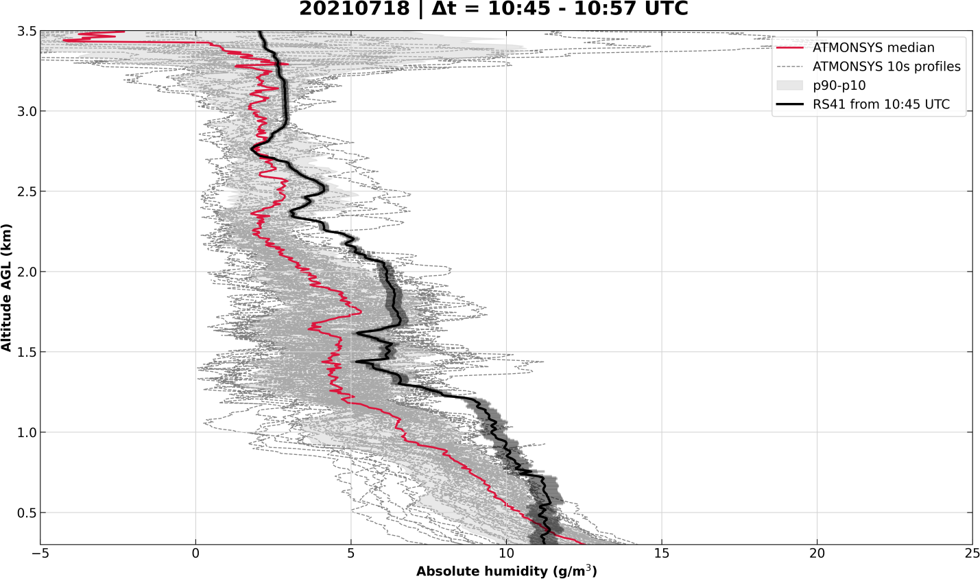 Figure 12Intercomparison between a radiosonde ascent and the ATMONSYS DIAL during the time of ascent from ground level to ≈ 3.5 Statistical uncertainties for the radiosonde are represented by black shading.