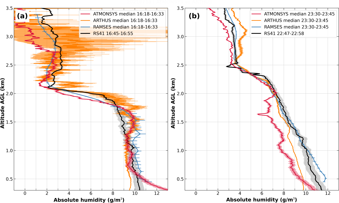 Figure 13An intercomparison of all three humidity lidars (ATMONSYS: red line, RAMSES: blue line, ARTHUS: yellow line) and the radiosonde (black line). Shown are median values from a time interval of 15 min around the afternoon ascent (a) and the midnight ascent (b), with reference to UTC. The temporal resolution of ATMONSYS and ARTHUS is 10 s, ad the data from RAMSES are shown with a resolution of 240 s. The radiosonde is at a temporal resolution of 1 s. The statistical uncertainties of the data are indicated by shading.