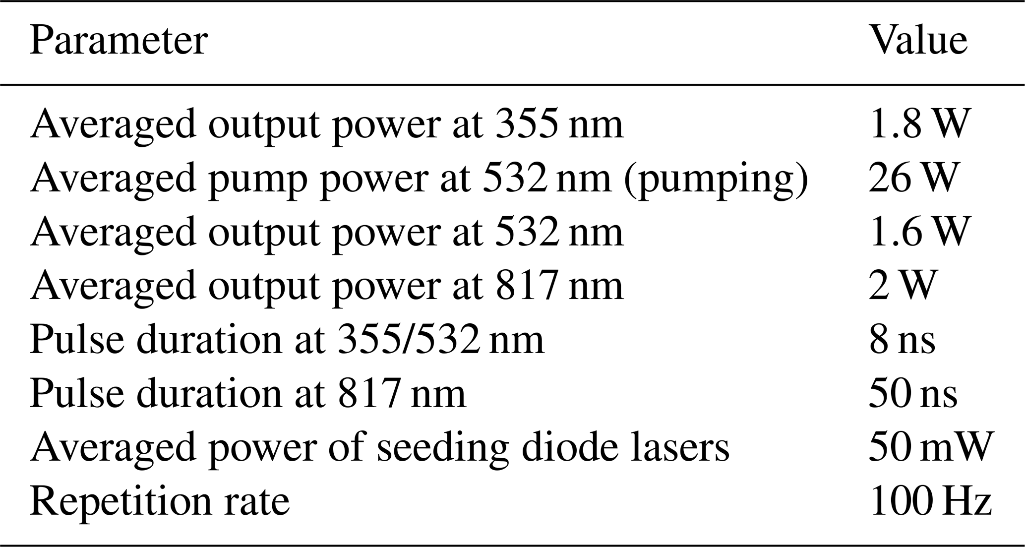 A seeded, diode-pumped, Nd:YAG laser (InnoLas) with a repetition rate of 100 Hz and a maximum average power of P =45 W at the wavelength λ=1064 nm is used as the main power source for all three lidar laser emissions. The elastic backscatter aerosol channel and the temperature rotational Raman channel can be directly operated with the emission after the second- and third-harmonic generator (532 nm and 355 nm), respectively. The water vapor measurements are performed with the ATMONSYS DIAL, which is operated at two wavelengths in the 817 nm band of water vapor in an alternating sequence. The laser transmission is driven by an in-house developed titanium sapphire (Ti:Sa) laser, which is pumped by a frequency-doubled Nd:YAG laser with ≈ 25 W at λ=532 nm. Details on the newly developed transversal pumping configuration and the resonator setup of the Ti:Sa laser as well as its implied advantages are given in Vogelmann et al. (2022). The exact wavelengths of the Ti:Sa are defined by two tunable external cavity-diode lasers (DL1/DL2, Fig. 2) which are operated in an injection-seeding procedure with shot-to-shot alternation between λon and λon similar to Ertel (2004). Whereas the main focus of the ATMONSYS lidar is set towards high power in the water vapor DIAL channel, the temperature and aerosol channels can be considered a pleasing side product. Therefore, the second-harmonic generator is tuned for maximum power and used as the pump light for the Ti:Sa laser. The third-harmonic generator is also tuned to maximum power at 355 nm but only takes the non-converted light at 1064 nm after the second-harmonic generator. The aerosol channel at 532 nm is then operated only with the unconverted shares from the third-harmonic generator as well. In the end, all pathways of the three different wavelengths (817, 532, 355 nm, all s-polarized) are combined congruently before they leave the ATMONSYS container. The average powers of all lasers can be seen in Table 1. The option of implementing a beam expander has been omitted due to concerns with changes in polarization as well as chromatic aberrations caused by the three different wavelengths. A possible workaround to this problem would have been the implementation of multiple beam expanders, which, in turn, requires a lot of space and bears the downside of added complexity in their proper adjustment.