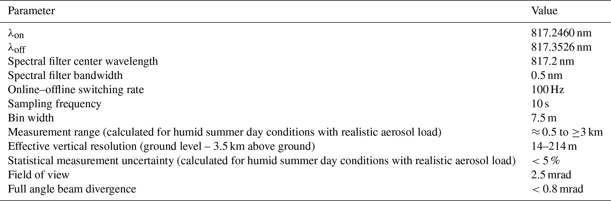 Here, Son/off represents the measured signals from the absorbed “online” wavelength λon and the unabsorbed “offline” wavelength λoff. Δσ↑ and Δσ↓ are the effective absorption cross sections of water vapor for the upward path of the narrowband laser light and the downward path, respectively, of the spectrally Doppler-broadened, backscattered light from air molecules. r is the vertical distance from the lidar and G refers to a correction term needed in order to account for the spectral variation of the backscattered light which is molecularly Doppler-broadened (see Bösenberg, 1998). Therefore, this term is dependent on the water vapor distribution itself as well as the ratio between molecular and particle backscatter. As can be seen in Bösenberg (1998), this term can become relevant in two cases. The first case would be that the molecular backscatter coefficients βM are much higher than the backscatter coefficients βP from aerosols () – which is usually not the case for observations within the PBL. The second case in which this term can become relevant is for atmospheric conditions in which there are strong gradients of – which is indeed the case within the PBL. This effect could principally be reinforced by the occurrence of fluorescing aerosol, caused by the emission of the 355 nm channel, which might act as a masked form of aerosol backscatter coefficients. In the current configuration of very small energies in the 355 nm channel (≈ 1 W), this effect is most probably negligible. Nevertheless, this effect has to be kept in mind in the case of substantially increasing pump lasers. However, after testing the effects of the correction term G, we found that for most heights of the PBL, the error is not dominant as it stays below values of ≈ 2 %. At those altitudes, however, where there are strong gradients of , the calculation of those is far from being trivial as the calculation of the gradient is very noisy if it is calculated from bin to bin. On the other hand, if the gradient is calculated over multiple bins, the locally very sharp aerosol gradients are artificially broadened and therefore inflict the corrections over a large range of altitudes. This bears the risk of applying a wrong correction at altitudes where G should not play a role. For those reasons, the humidity calculations presented herein omit the correction term G, following the reasoning that an overall small error is preferential over the introduction of artificial errors due to the implementation of a problematic correction term. Recent instrument developments show a method which could potentially circumvent this problem by adding a high-spectral-resolution lidar (HSRL) channel to DIAL systems, providing reliable information on molecular and particle backscatter properties without any dependence on a proper Klett inversion algorithm (Klett, 1985; Stillwell et al., 2020; Spuler et al., 2021; Hayman et al., 2024). Despite the fact that the ATMONSYS has been designed without an additional HSRL channel, following the thoughts of Späth et al. (2020), effects of the Rayleigh–Doppler-broadened signal are minimized if the online frequency is chosen to be near the inflection point of the absorption line as done for this measurement set, taken on a humid summer day. In order to rule out the possibility that Rayleigh–Doppler broadening crosses the absorption line peak, we choose an absorption line under the premise of ensuring a suitable optical depth, resulting in a related wavelength λon in a position further out than the actual inflection point of this absorption line. This, however, comes with the downside of not fully guaranteed minimization of a potential Rayleigh–Doppler error. The online frequency has been chosen to be λon,vac=817.2460 nm, which is in the flank of an absorption line centered at (Ponsardin and Browell, 1997). The offline frequency has been set to λoff,vac=817.3526 nm. Further details on the DIAL specifications can also be read in Table 2. Beyond that, Vogelmann et al. (2022) provide a detailed description regarding resonator stabilization, seeding, and spectral characteristics of the laser beams. The calculation of the effective σon/off in both the upward and downward direction is a crucial point within the DIAL equation. In order to account for the Lorentz pressure broadening and the Rayleigh–Doppler broadening, a convolution of those two effects has to be calculated which is described by a Voigt function. This function is dependent on both pressure and temperature over height. Therefore, in order to calculate precise absorption coefficients, additional information on the atmospheric state is needed. More details on both the calculation of the σ profiles and the spectroscopic line characteristics can be found in Ponsardin and Browell (1997), Bösenberg (1998) or Vogelmann and Trickl (2008). For all data presented in this paper, the prevailing atmospheric pressure and temperature conditions were taken from radiosonde ascents that are operationally performed by the DWD nearby (Sect. 3).
