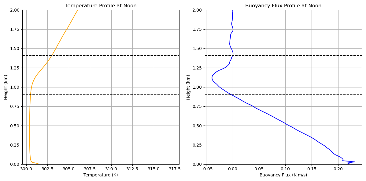Figure 3The potential temperature and buoyancy flux profiles at 12:00 CDT on 8 August 2017. The dashed lines show the top and bottom of the entrainment zone, where the potential temperature gradient is strongest and the buoyancy flux is negative.