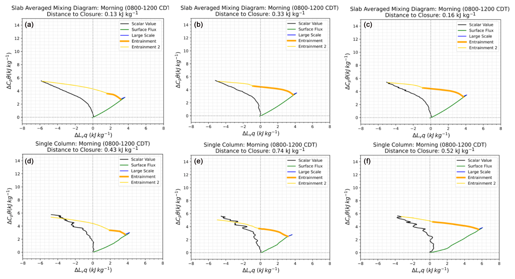 Figure 4Mixing diagrams for the morning (08:00–12:00 CDT) of 8 August 2017 at SGP, comparing the impact of three different BL depth definitions: the level of neutral buoyancy of a surface-based parcel of air (a, d), the maximum humidity variance (b, e), and the minimum potential temperature flux (c, f), for the slab output (a, b, c) and the single-column output (d, e, f).