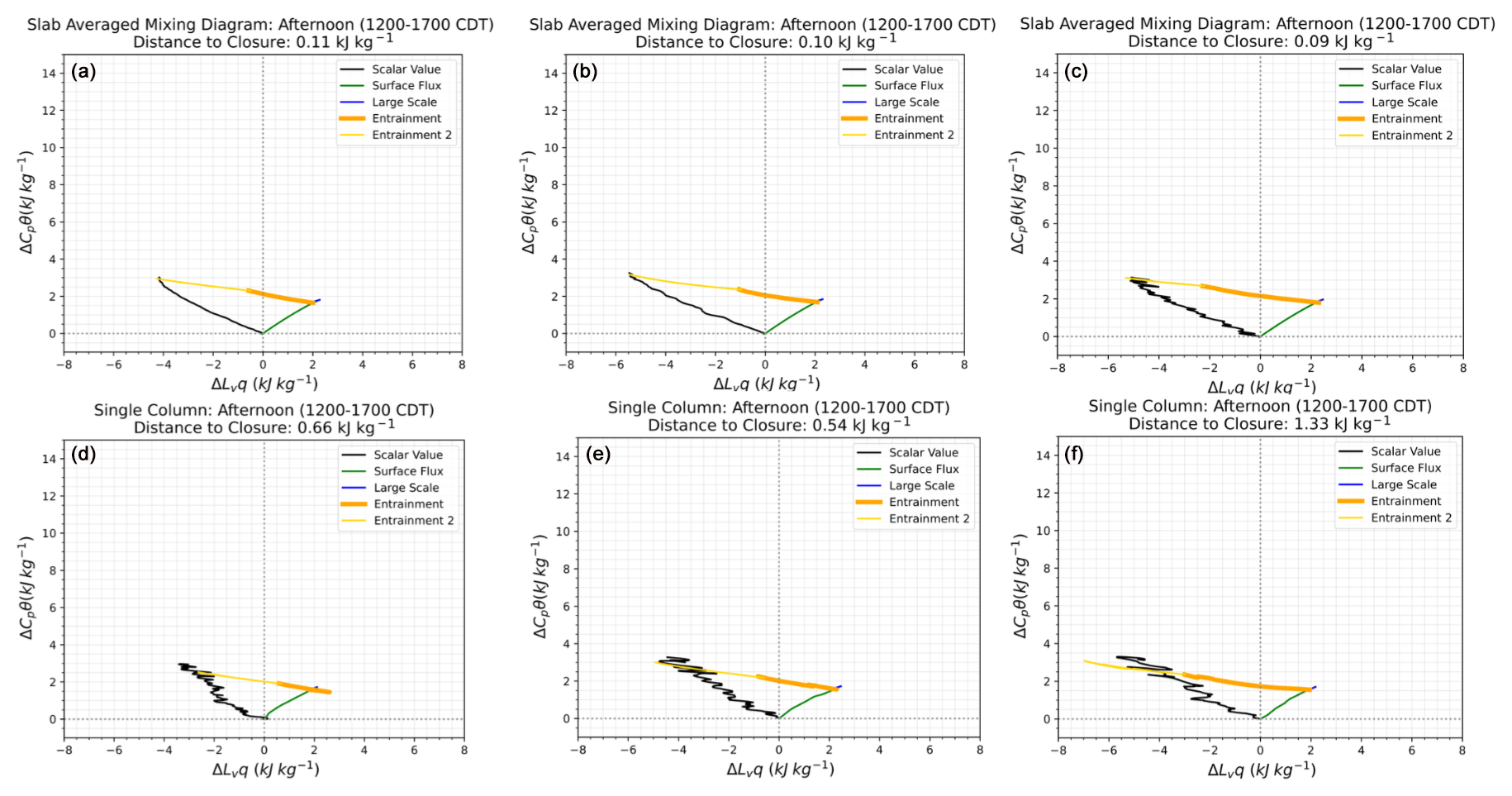 One method for estimating entrainment was shown in Wakefield et al. (2023) (hereafter W23), using a mixing diagram framework inspired by Betts (1992). Betts developed the mixing diagram method for analyzing aircraft data in order to study the evolution of the daytime mixed layer, using vector representations of heat and moisture budgets. This method was later applied to evaluate land–atmosphere couplings by Santanello et al. (2009). In a mixing diagram, the evolution of the heat and moisture budgets is plotted on the same figure as the vector components that make up that evolution, offering a visual representation of the contributions of various forcings to the changes within the mixed layer. Betts (1992) defined the mixed layer budget for an atmospheric property ϕ as