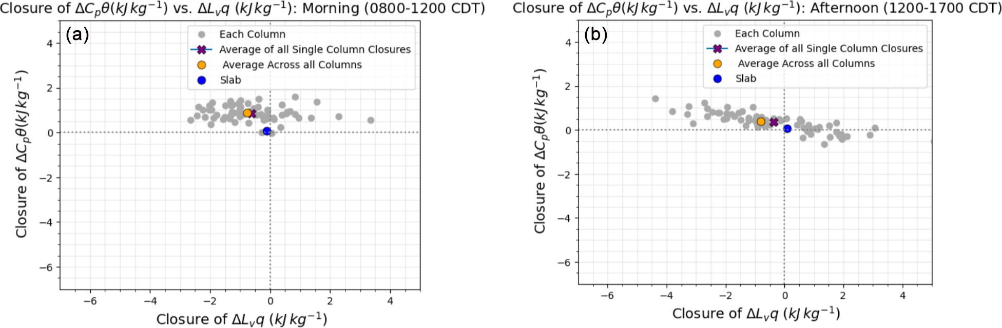 Figure 8Scatter plots showing the closure in the sensible and latent heats for each single column (gray), the average of the closure values for all of the columns (purple), the average across all 64 columns (orange), and the slab average (blue) for 8 August during the (a) morning (08:00–12:00 CDT) and (b) afternoon (12:00–17:00 CDT). In the morning, the average of all of the columns (purple) and the average across all 64 columns (orange) points are on top of one another.