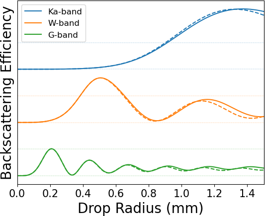 One common shortfall of the Doppler-based methods mentioned above is the difficulty in accounting for the effect of the vertical air motion on the mean Doppler. In this respect, Mie scattering in millimeter-wave radars can be useful in constraining the vertical air motion when the size of drops is similar to the observing wavelength of a radar system. Specifically, the backscattering efficiency at a particular observing wavelength contains several peaks and valleys as a function of drop radius, as seen in Fig. 1. Lhermitte (1987) first proposed the technique of using full W-band Doppler spectra that show similar oscillatory shapes along with information about the theoretical backscattering efficiency in each velocity bin to simultaneously retrieve information about vertical air velocity and rain DSD. The difference between the theoretical and observed locations of any minima seen in the Doppler spectrum would yield information about vertical air motion in the scene, while the relative heights of any maxima seen in the spectrum would yield information about the DSD of the scattering particles. Kollias et al. (2002) demonstrated vertical air motion retrievals derived from W-band Doppler spectrum observations of stratiform precipitation. Giangrande et al. (2010) was the first to demonstrate the full utility of this technique in analyzing W-band Doppler spectra. This work retrieved measurements of both vertical winds and best-fit parameters to a Marshall–Palmer log-linear DSD; however, useful spectra can only be captured at the W-band for storms with large droplets greater than ∼0.8 mm. As seen in Fig. 1, the first backscattering minimum occurs at a larger drop radius for lower observing frequencies. Thus, to be sensitive to measurements of drops as small as drizzle (smaller than a diameter of 0.5 mm), it is necessary to make Doppler spectrum measurements at a higher frequency. For the G-band in particular, the first minimum is located at a small enough radius that its location is insensitive to the parameterization of the drop aspect ratio, permitting high-accuracy quantification of the vertical air motion in all but the lightest liquid-phase precipitation. The utility of G-band observations was theorized by Battaglia et al. (2014) and first demonstrated by Courtier et al. (2024) in the addition of G-band Doppler spectra to a multi-frequency DSD retrieval.