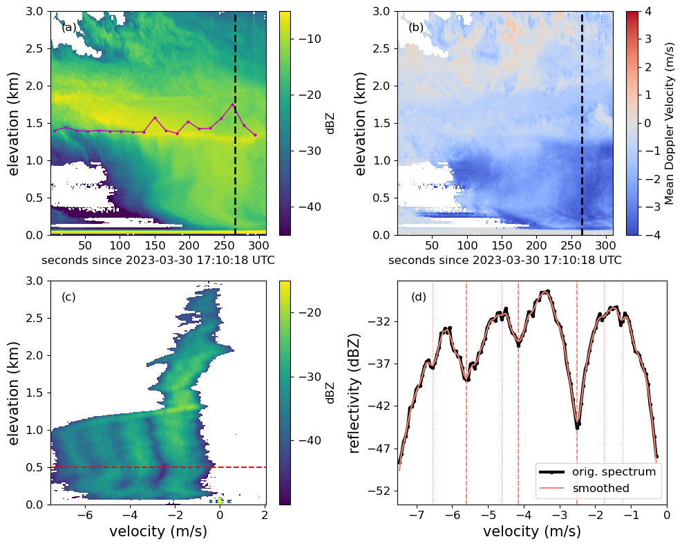 Figure 2(a) Reflectivity curtain for several minutes of G-band radar data collected on 30 March 2023. The pink line shows the location of the cloud base, as measured by the ARM laser ceilometer. (b) Mean Doppler velocity corresponding to the reflectivity curtain in (a). (c) A full Doppler spectrum from data collected during the time marked by the dotted black line in (a). The dashed red line shows the elevation for the example 1-D spectrum on the right. (d) The black line represents the original measured spectrum, whereas the pink line shows the Wiener smoothed spectrum. The thicker dashed vertical lines represent minima in the spectrum that are considered to be truly correlated with minima in the backscattering function, whereas the thin dashed lines represent other candidate minima that the find_peaks
