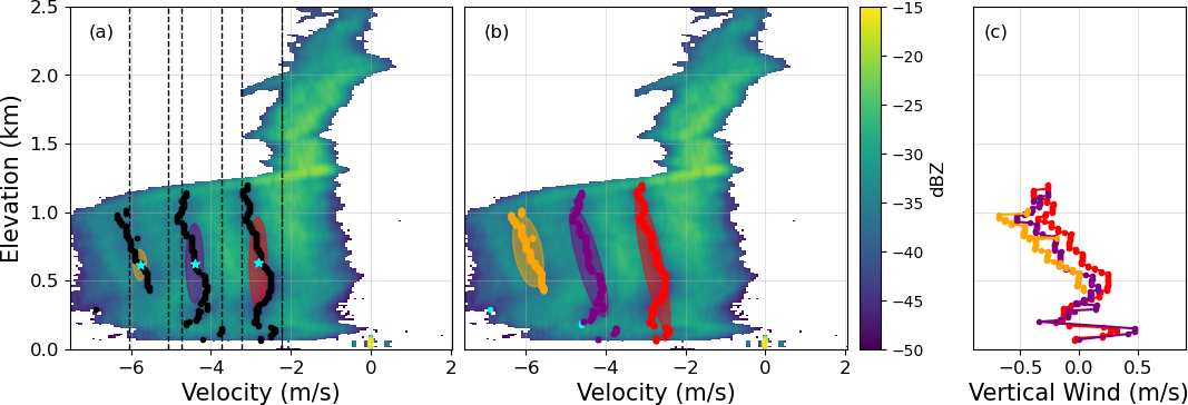 Figure 3(a) A 2-D Doppler spectrum with all identified minima overlaid. The dashed black lines represent the boundaries used to define the initialization of the classifier. The blue stars represent the means of the points within the boundaries, and the colored ellipses represent the initial covariances in both the height and the velocity directions. (b) A 2-D Doppler spectrum with all identified minima classified according to their correlation to notches in the backscattering function. The cyan points are minima that were filtered out as being erroneous, and the ellipses show the probability spaces of the Gaussian mixture model components. (c) Vertical winds calculated from the classified minima.