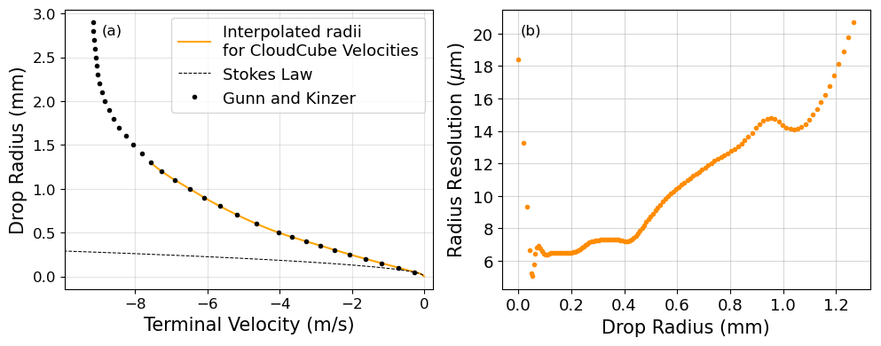 Figure 4(a) The terminal velocity relationships plotted along with interpolated radius values corresponding to the measured CloudCube spectrum velocities. The transition between the Stokes' law regime and the Gunn–Kinzer interpolated points occurs at a radius of 50 µm. (b) The radius resolution plotted as a function of the radii interpolated from the spectrum velocities.
