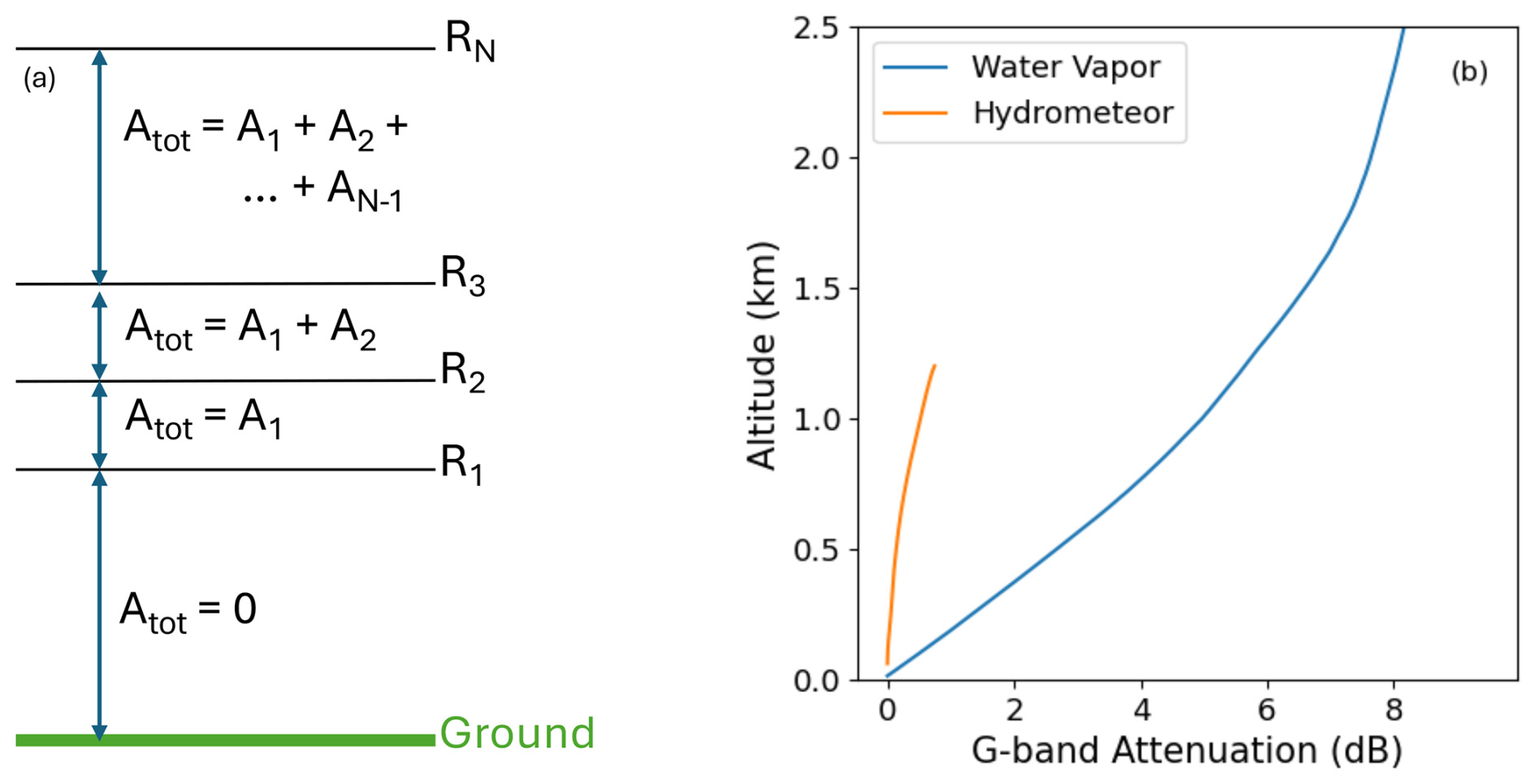 Figure 5(a) G-band attenuation contributions by both water vapor and hydrometeors. (b) Diagram visualizing how hydrometeor attenuation is accumulated over elevation.