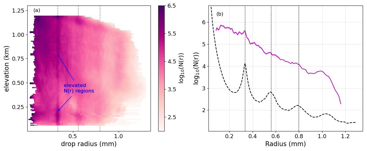 Figure 6(a) DSD for each elevation calculated with the no-turbulence assumption. Dotted gray lines represent particle radii that are at minima in the backscattering efficiency. (b) The pink curve shows the DSD at 1 km, with the shaded region representing the 1σ instrument error, ϵs. The vertical dotted lines represent the backscattering minima, and the dashed black curve represents the limiting DSD values that CloudCube would have been able to detect at this elevation. CloudCube's sensitivity is −50 dBZ at 1 km. N(r) is in units of .