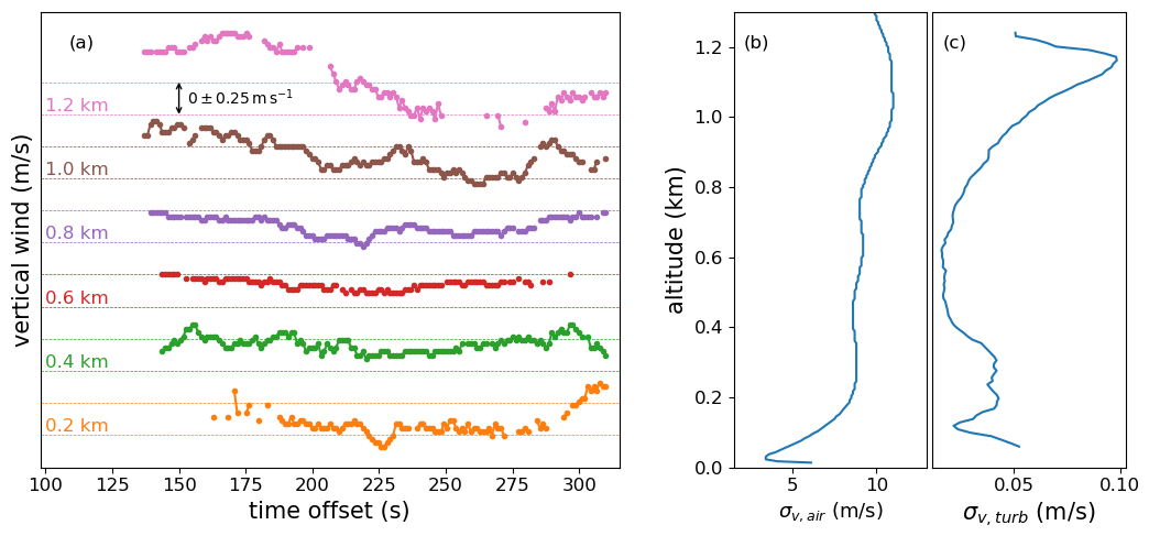 Figure 8(a) Depiction of how the vertical wind varies with time for a few different elevations. The dotted lines represent ±0.25 m s−1 for each elevation. Plots of (b) the horizontal wind speeds measured by the sondes and (c) the final calculated turbulent broadening, in units of m s−1.