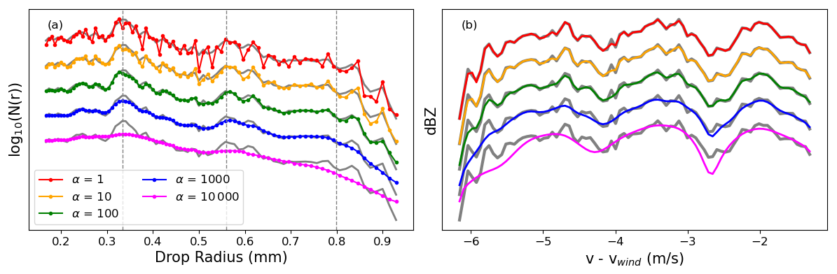 Figure 9(a) DSDs retrieved from the 1-D spectrum shown in Fig. 2d using five different regularizer weights. The grey curves plotted underneath the colored plots show the DSD computed from the turbulence-free assumption for comparison. The dotted vertical lines represent particle radii that are at minima in the backscattering efficiency. N(r) is in units of . (b) The smoothed spectra derived from each of the DSDs. The grey curves underneath show the measured spectrum.