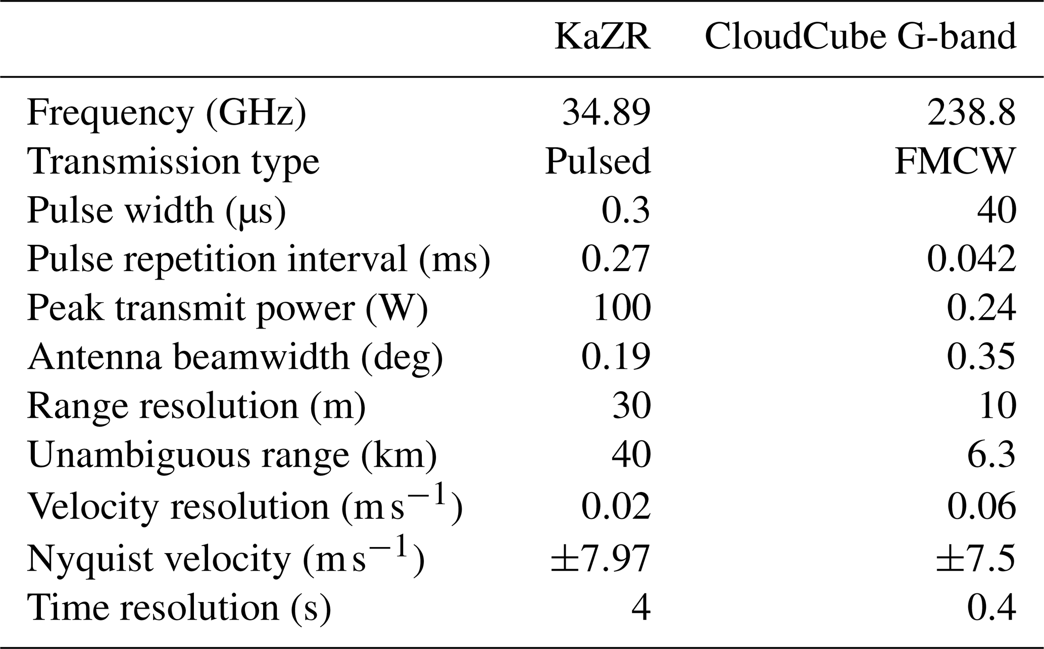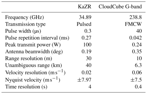 This paper also uses data taken from several ARM instruments to both aid and supplement the presented analysis. Notably, our retrievals rely on temperature, pressure, and humidity profiles collected by radiosondes (Holdridge, 2020) for determining the correct values of particle backscattering efficiencies, fall speeds, and gaseous attenuation. The retrievals are validated with the ARM Ka-band radar (KaZR; Widener et al., 2012; see the radar parameters in Table 1) and the 2-D video disdrometer (VDIS; Bartholomew, 2020) instruments.
