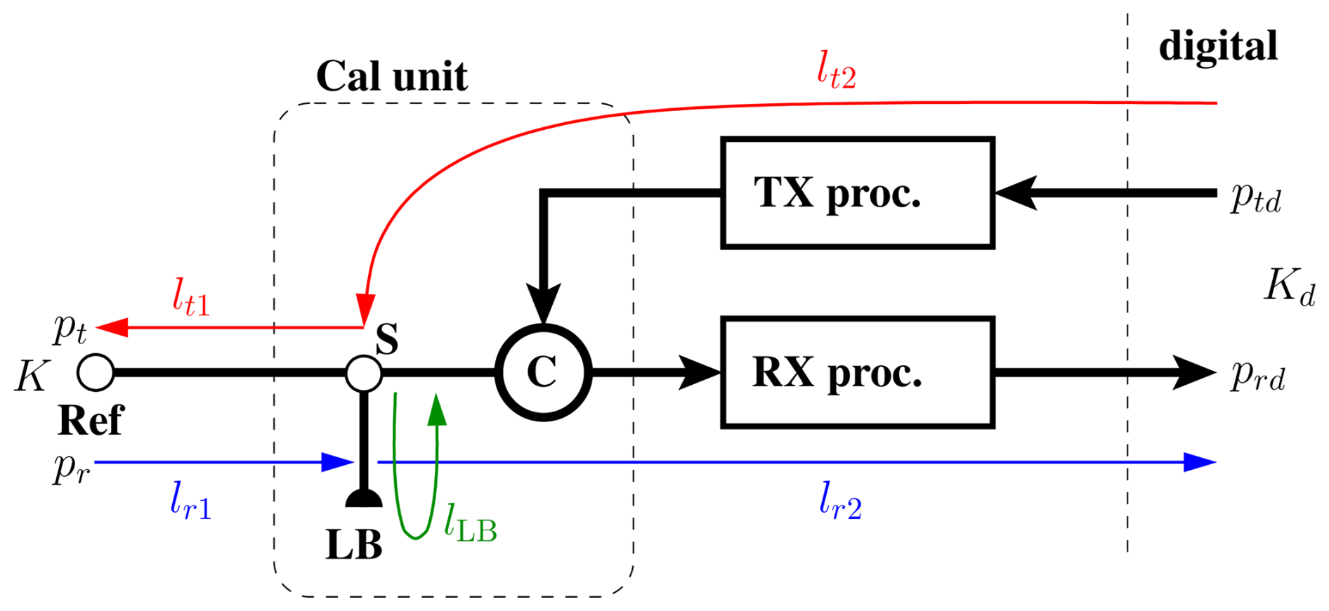 where GLB is the gain of the loop-back path from the switch (S) to the loop-back (LB) and back to the switch (S). The ratio between the transmitted calibration power ptd,cal and the received calibration power prd,cal is the calibration constant Kcal.