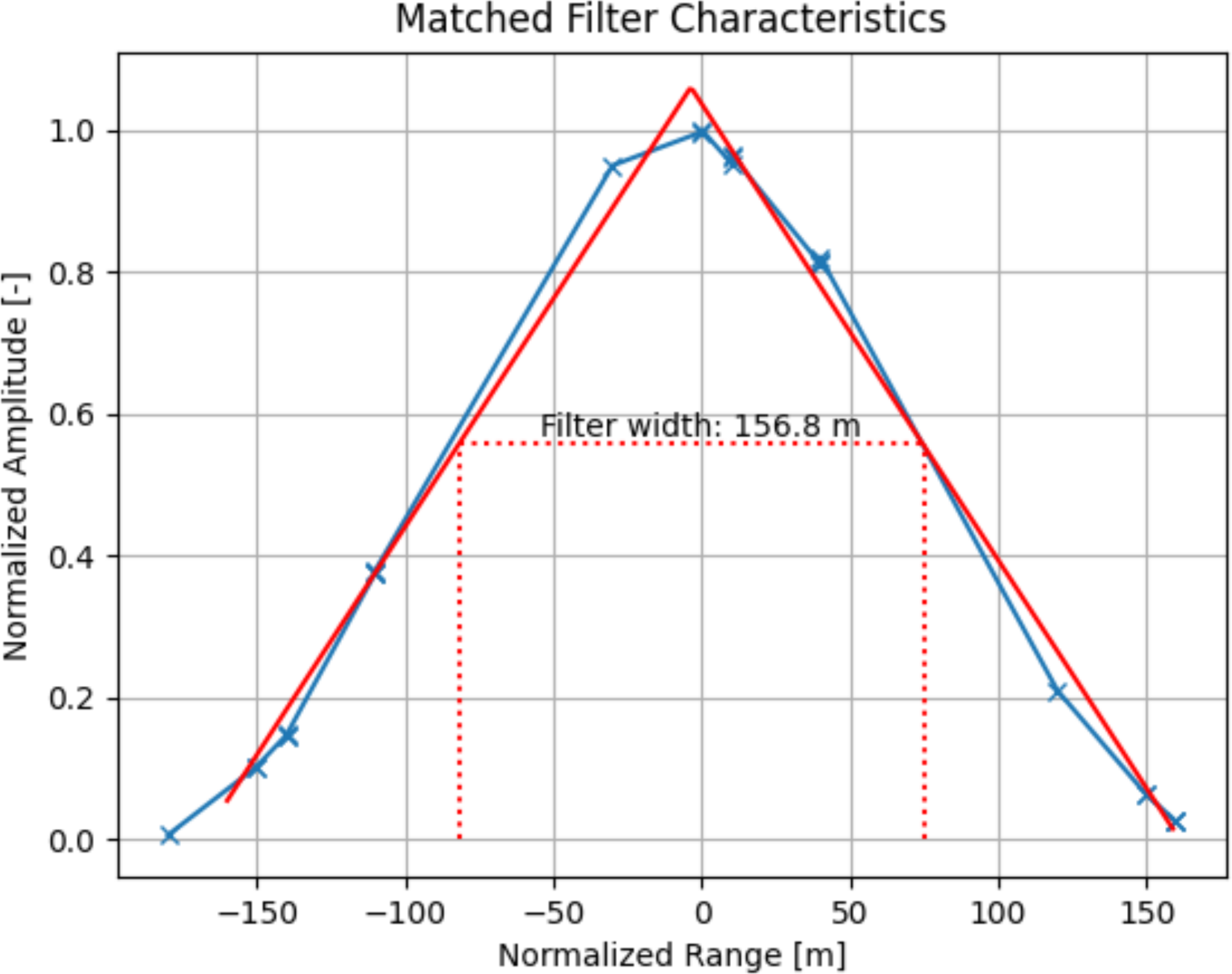 This matched filter effect is illustrated in Fig. 3 where data from the StXPol radar (see Sect. 4) have been used. A static target was generated at various distances from the radar while its reflectivity was kept constant at all positions. The target's normalized amplitude in the voltage domain as detected by the radar is plotted as a function of the target range. By applying a triangular least-square fitting procedure to the measured data and evaluating the width of the fitted triangle at half of its maximum, the width of the matched filter can be experimentally inferred. In the data depicted in Fig. 3, this width was determined to be 156.8 m, which is very close to the nominal range gate size of 150 m corresponding to the employed pulse width of τpw=1 µs.