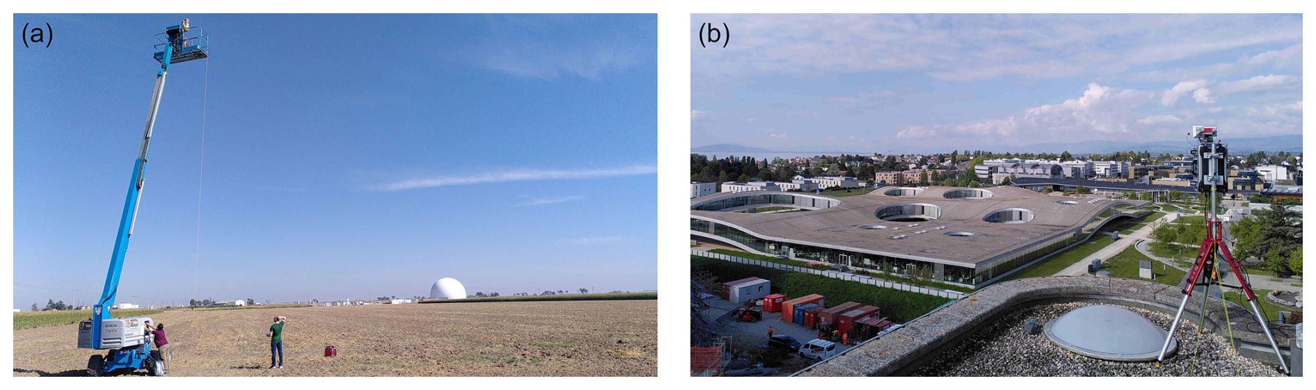 Figure 4 (a) Target simulator on the elevated platform with CHILL and SPLASH in the background. (b) Experimental setup in Lausanne.