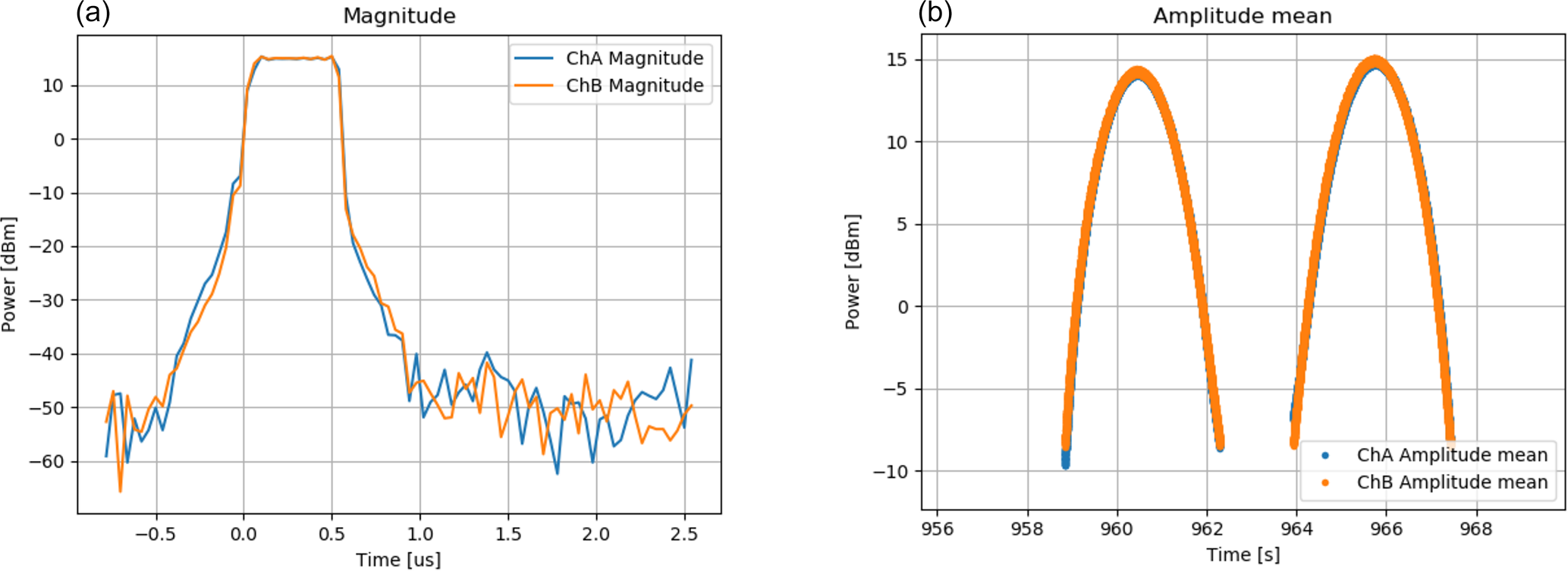 Figure 6 shows the shape of the short pulse in the left panel and a series of maximum pulse power amplitudes over the suite of two sector scans in the right panel. An important and obvious feature of both figures is the fact that the data from the two RTS channels overlap very well. This not only indicates that the two radar channels transmit an equal amount of power, but it is also a first confirmation that measurements are not affected by multipath contamination because the two polarizations are unlikely to be equally affected by the multipath.