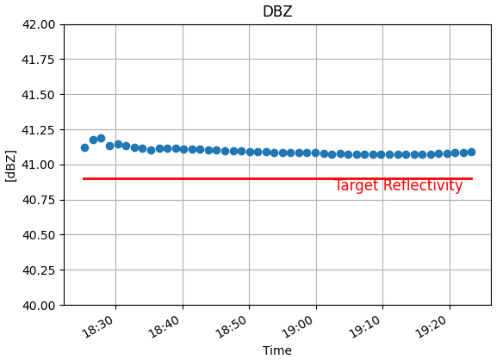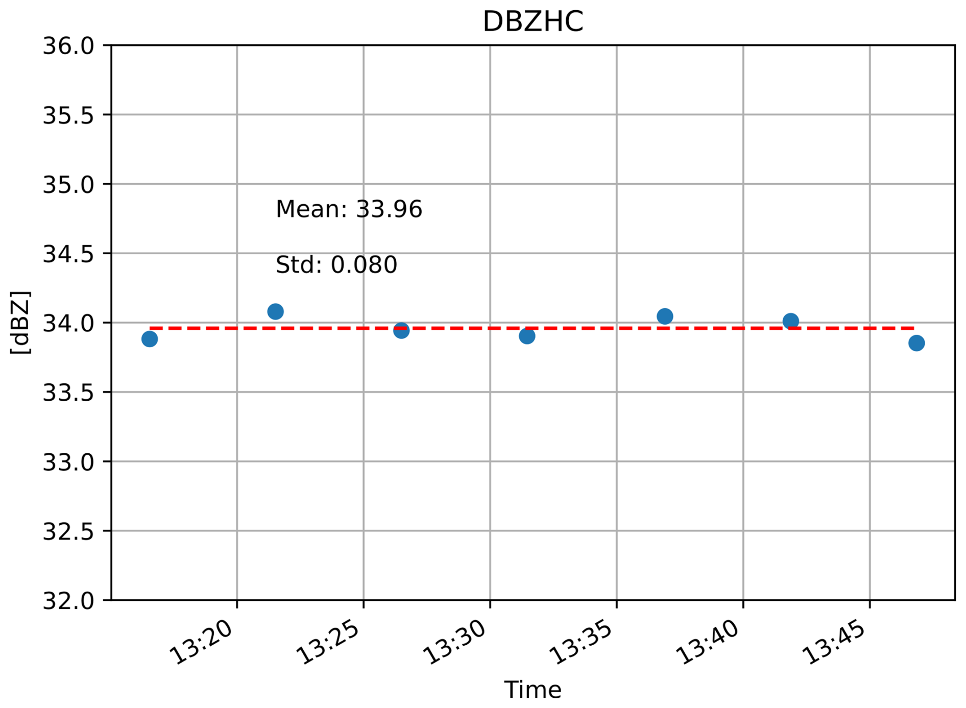 A 1 h reflectivity time series was collected from sector scans that were performed at an elevation of 0.68°. The radar's reflectivity data underwent a 1D Gaussian fitting procedure, after which the maxima of the fitted curves were used to produce the plot shown in Fig. 15. The extracted radar data (mean: 41.1 dBZ) exhibit good agreement with pre-defined target reflectivity and the temporal stability is very high over 1 h (standard deviation: 0.026 dB).