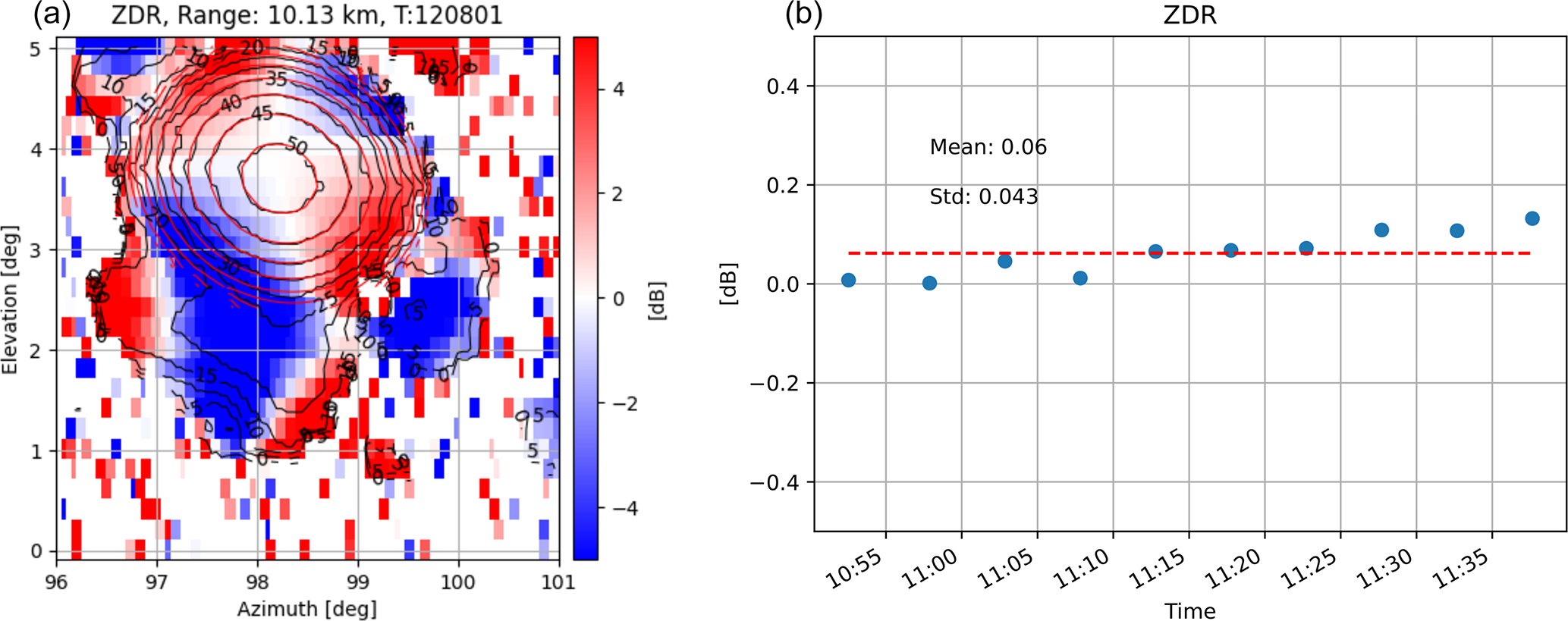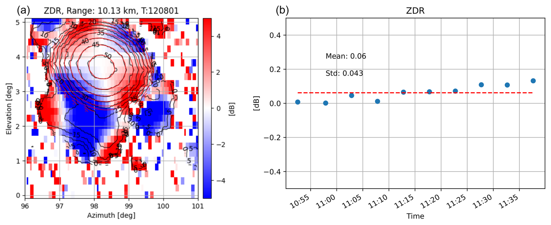 The low bias and the high short-term temporal stability suggest that the radar is well-calibrated with respect to the differential reflectivity. For the LP data, a similar data acquisition procedure exhibited a Zdr bias of 0.5 dB.