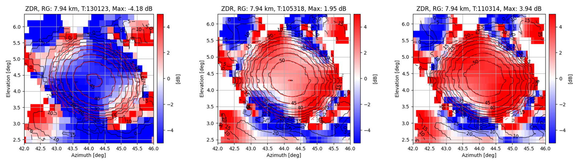 An example of a box scan radar reflectivity acquisition performed around an electronic target that was generated for the short pulse channel is shown in Fig. 8. The target intensity was set to 60 dB. The maximum of the Gaussian fit (red contour lines in Fig. 8) assumed a value of 55.1 dB and hence a large reflectivity bias can be diagnosed.
