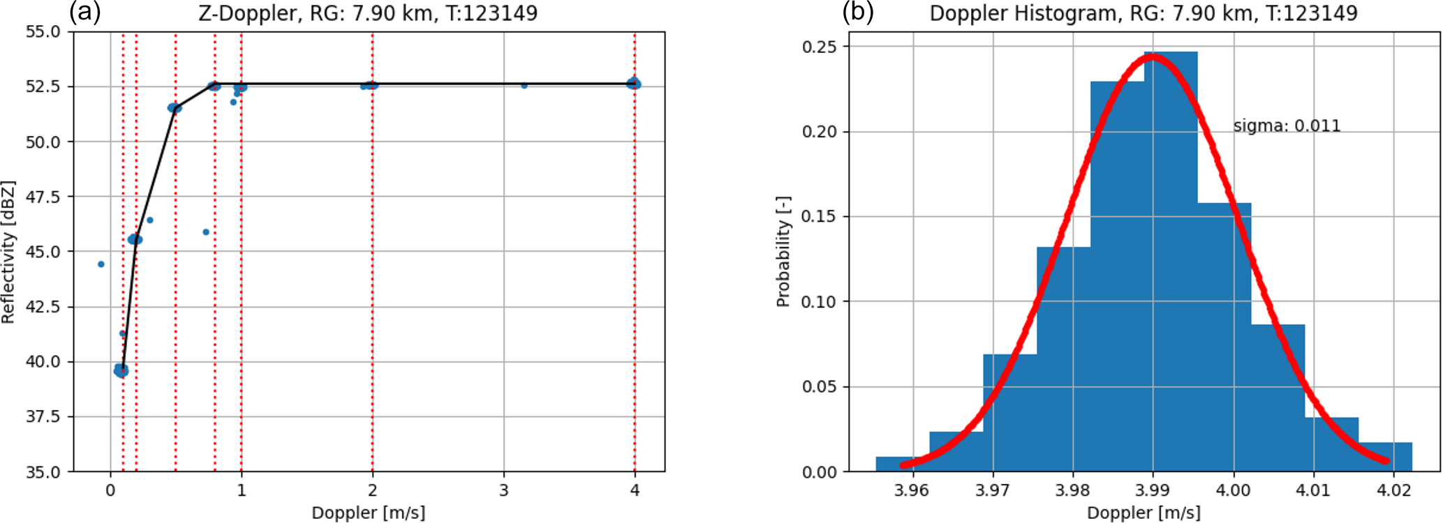 Figure 12 (a) Filter curve of a 0.83 m s−1 wide clutter filter that was tested with a stable reflectivity target with changing Doppler properties. The red lines indicate the Doppler speeds that were given to the target. (b) Histogram of the same data as shown in the panel on the left-hand side, but extracted around a Doppler speed of 4 m s−1. Data were acquired in FFT mode.