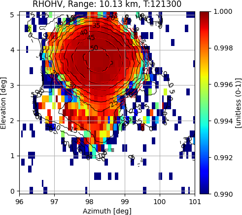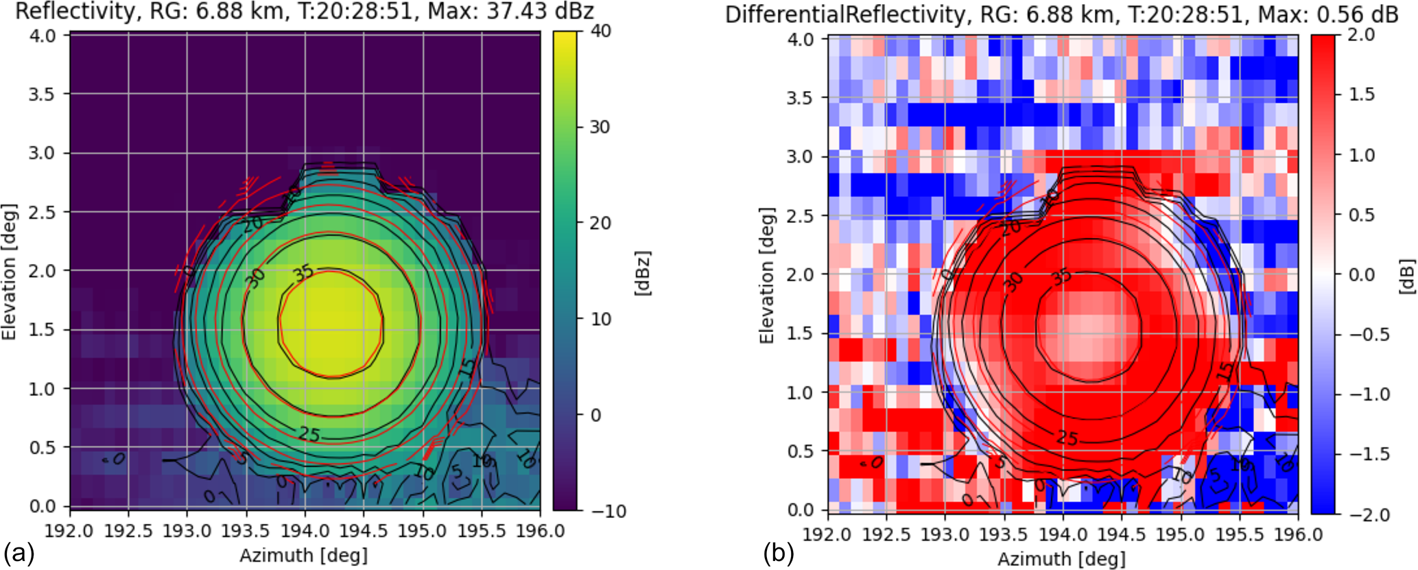 With the CHILL radar, only six sector scans with a spacing of 0.1° in elevation were obtained for one repetition. Because of the size of the CHILL radar antenna, its far field is located at approximately 4.8 km, while the target simulator was set up at a distance to the radar of 470 m. In consequence, it is expected that the beam is not yet properly formed away from the center axis and therefore does not exhibit its final narrow shape yet. Nevertheless, it can be assumed that one sector scan hits the RTS with sufficient accuracy. The subsequent analysis of the CHILL data is therefore based on only one sector scan that was performed at an elevation of 0.68°.