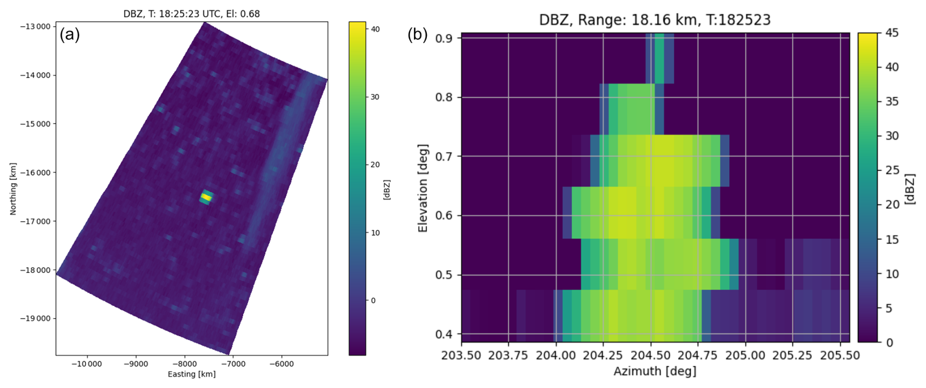 Figure 14 (a) CHILL radar reflectivity sector scan at the elevation of the RTS. (b) Vertical cut of CHILL reflectivity data through six sector scans extracted at the location of the generated target.