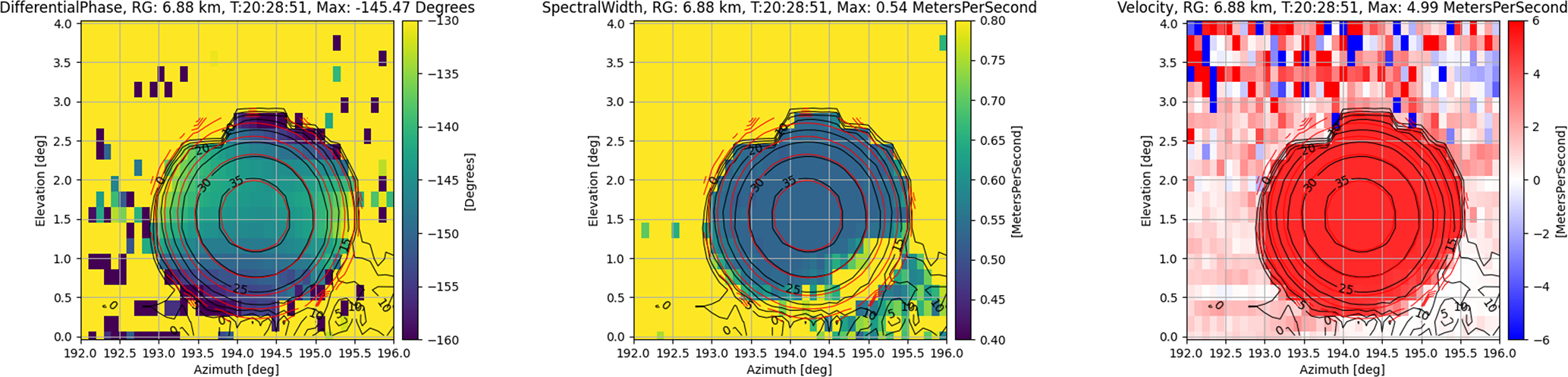 Figure 17 From left to right: box scans of the differential phase Ψdp, the Doppler spectrum width σ(vD), and the Doppler velocity vD from a target that was scanned with the SPLASH radar and exhibited a Doppler velocity of 4 m s−1.