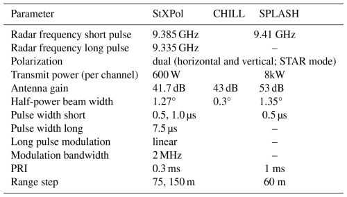 The Solid State X-band scanning Polarimetric radar (StXPol) built by ProSensing Inc. for EPFL is a radar system intended to provide measurements of clouds and precipitation and specifically designed to sustain high wind conditions and harsh cold environments in mountainous and polar regions. Able to operate in STAR (simultaneous transmission and receive) or alternate modes, it was employed in these tests in the former setting. It is equipped with a 1.82 m antenna (41.7 dB gain) and two 630 W solid-state amplifiers. The other radar main characteristics are provided in Table 2.