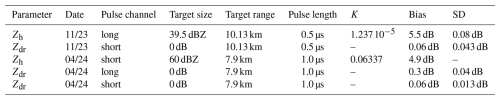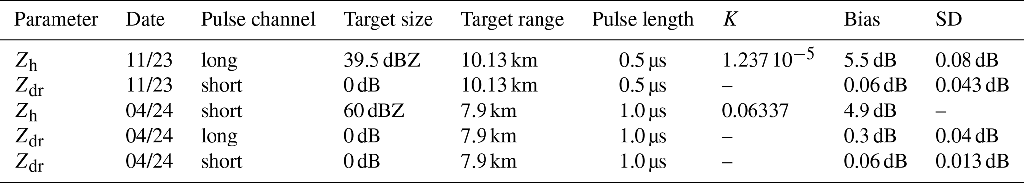 Relevant StXPol calibration results for absolute and differential reflectivity are provided in Table 3. The RTS power fraction, K, is provided for absolute reflectivity calibrations only and not for differential reflectivity, where the absolute value of K is irrelevant. In addition, the standard deviation of the time series of measurements is calculated only if more than three box scans per target were completed.