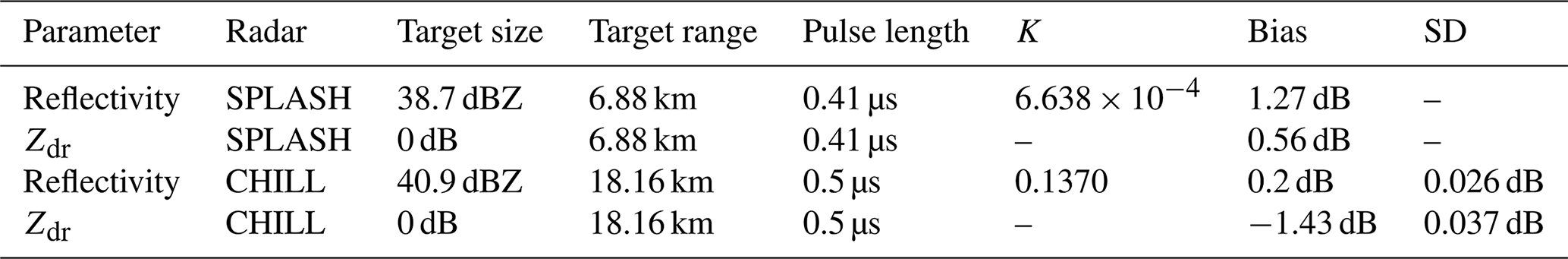 For differential reflectivity calibration, the CHILL radar exhibited a considerable bias of −1.43 dB, suggesting the need for further investigation either into system-specific sources of error or possible drawbacks of the experimental setup. In the interpretation of this measured bias it needs to be taken into account that X-band CHILL is a particularly difficult radar to calibrate due to its extremely narrow beam width of 0.3°. In elevation, the generated target was scanned with a resolution of 0.1°, which is most likely sufficient for absolute reflectivity calibration but probably insufficient for Zdr calibration due to the large variation of this observable within the antenna beam. It is concluded that the scan resolution for accurate Zdr calibrations should be smaller than a tenth of the antenna's half-power beam width.