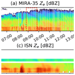 As can be seen in Fig. 8a and b, 28 May featured continuous liquid precipitation at the surface with varying intensity over the observed time range. Most precipitation fell in the form of stratiform rain. The stratiform precipitation was occasionally interrupted by convective cells moving over MIRA-35 most notably recognizable at 08:30 UTC, shortly after 10:00 and 13:30 UTC with stronger rain intensity identifiable by high Ze values of 30 dBZ for MIRA-35 or 40 dBZ for POLDIRAD. The first convective cell at 08:30 UTC also shows a very distinctive signature in the MDV of MIRA-35 in Fig. 9a.