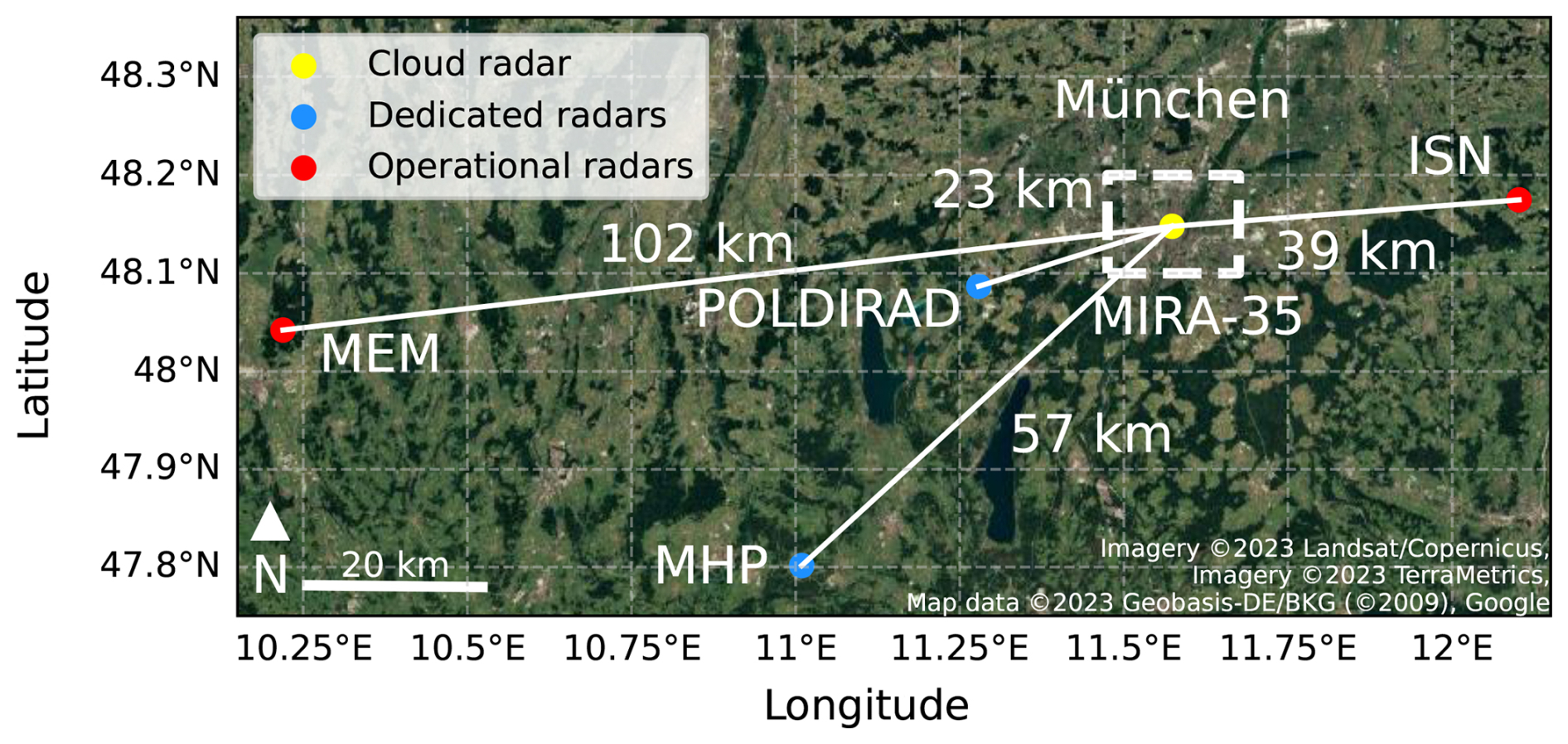 Figure 3Map showing all radar locations relevant for this study. The depicted area is a zoom-in of the white rectangle in Fig. 1. The position of MIRA-35 (yellow dot) is in the center of Munich. Dedicated and operational radars are marked blue and red, respectively. The white rectangle marks the area of interest for this study. Imagery © 2023 Landsat/Copernicus, Imagery © 2023 TerraMetrics, Map data © 2023 Geobasis-DE/BKG (© 2009), © Google.