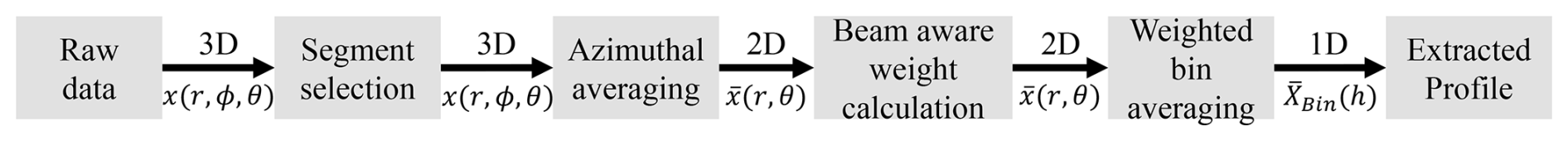 Extending EVPs spatially, Murphy et al. (2020) then proposed the method of extracting columnar vertical profiles (CVPs) which sources data from a much larger segment. After azimuthal averaging and favoring data points more closely to the desired location, an inverse distance weighted moving averaging technique is applied which maps the data to a regular vertical grid. This leads to a considerable improvement in the reduction of noise as well as an increase in vertical resolution. The method however can also lead to the occurrence of gaps in the extracted profiles where the vertical distance between data points of successive elevation scans is bigger than the moving average bin size (Murphy et al., 2020; Bukovčić et al., 2020). This severely worsens the quality of the extracted profiles at long distances away from the PPI scanning radar or when only a limited number of elevation scans is available. CVPs are often complemented by QVPs or RD-QVPS and used to study different parts of fast moving atmospheric phenomena like hurricanes (Hu et al., 2020; Hu and Ryzhkov, 2022) or to retrieve microphysical properties of ice hydrometeors via polarimetry, Doppler fall-speed and dual-wavelength ratio observations (Oue et al., 2025).