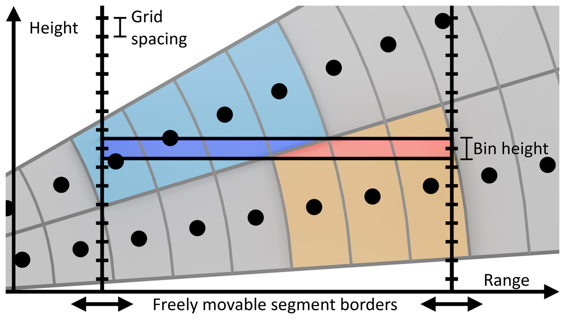 Data points not within a height bin still contribute to the height bin average if measurement volume intersects the height bin, reducing gaps in areas with low data point density.