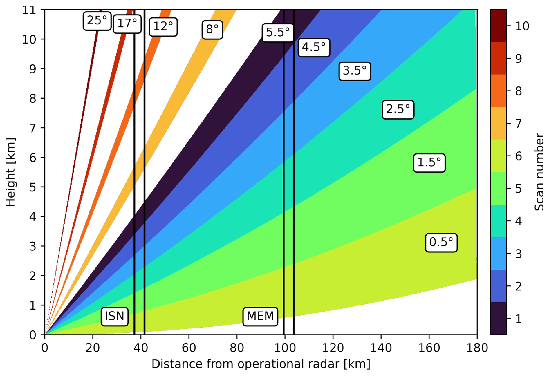 For higher signal-to-noise ratios and additional data points it is therefore beneficial to try and combine the data of two or more operational radars in the range of the point of interest. Since BA-CVPs consider beam-broadening, operational radars at different ranges from the point of interest can be included and are weighted according to beam extent. Additionally one operational radar can cover potentially occurring gaps in the data of another operational radar. This can be seen in Fig. 7 where the current scan strategy of the German operational radar network is depicted. Shown are the 10 operationally performed PPI scans from a side view colored in order of execution with their respective elevation angle. Marked by black vertical lines is the radial extent and range of the extracted BA-CVPs for ISN (at ca. 40 km) and MEM (at ca. 100 km) in relation to MIRA-35. While the extracted profile of ISN features higher vertical resolution at low altitude, where the data points are still spaced more narrowly, the profile also has noticeable gaps at higher altitudes. In contrast, the extracted profile of MEM has no gaps but only low vertical resolution as the data points are spaced further apart. The gaps in the profile of ISN are a result of the limited number of performed PPI scans and the short distance between ISN and MIRA-35 with little beam broadening. These gaps however can be covered with data of the extracted profile of MEM.
