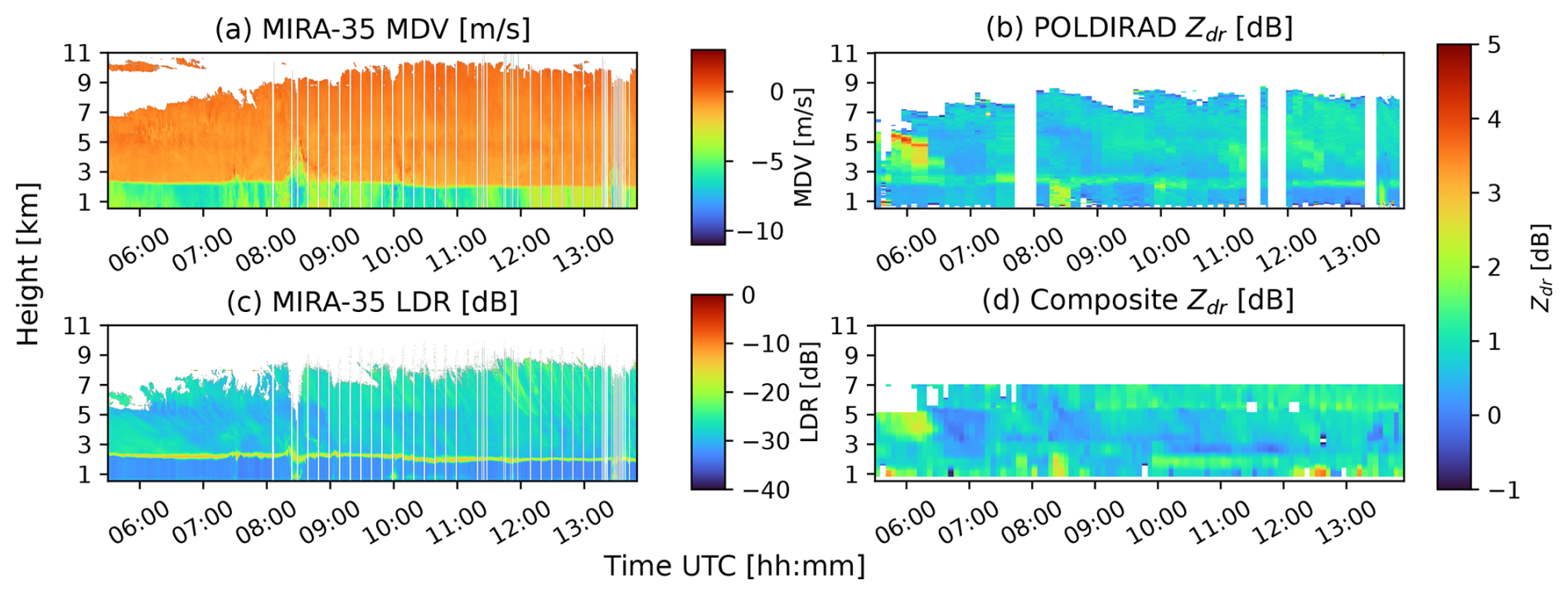 The melting layer (ML) was situated at an approximate altitude of 2.4 km with little variability during the day and only a slight decrease in height to roughly 2 km during the second half of the observed time frame as identifiable by the sharp increases in reflectivity at those heights seen in Fig. 8a for MIRA-35 and as a bright band for POLDIRAD in Fig. 8b. The height of the melting layer can also be identified using the Zdr measurements of POLDIRAD in Fig. 9b which shows a vertically shallow bright band between 2.3 and 2.6 km. This is confirmed by the MDV and LDR measurements in Fig. 9a and c. The MDV shows a very concise transition from low fall speeds just below 0 m s−1 to high fall speeds at −5 m s−1, while the LDR displays a very shallow bright band with elevated LDR values up to −10 dB.